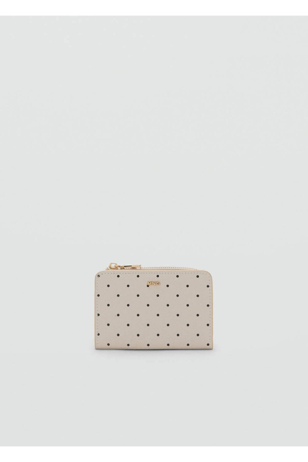 Small size, Polka dot pattern, Six compartments for cards, Zippered pocket, Snap button closure, Embossed logo.