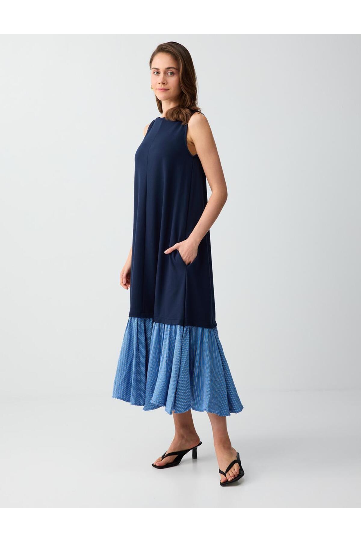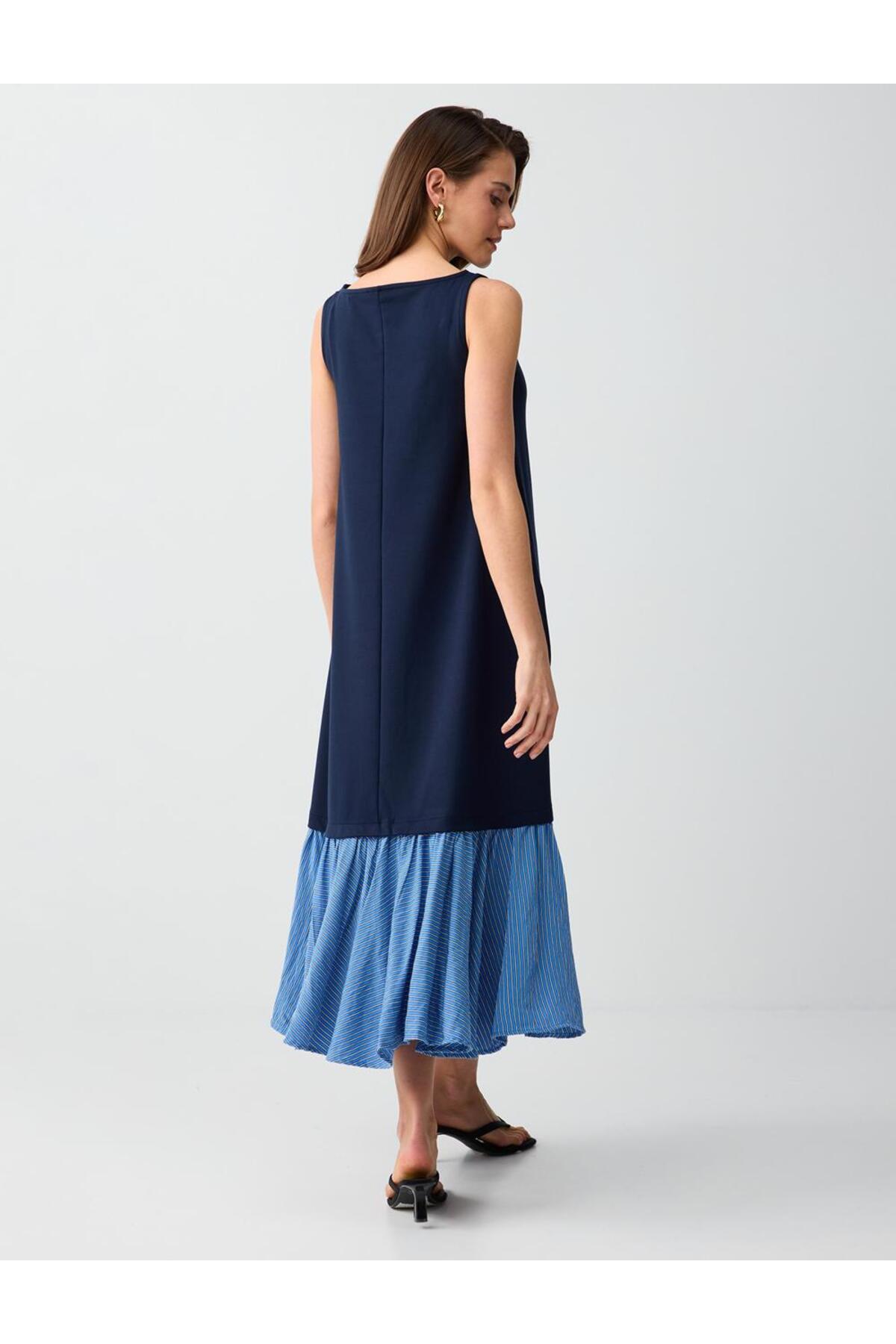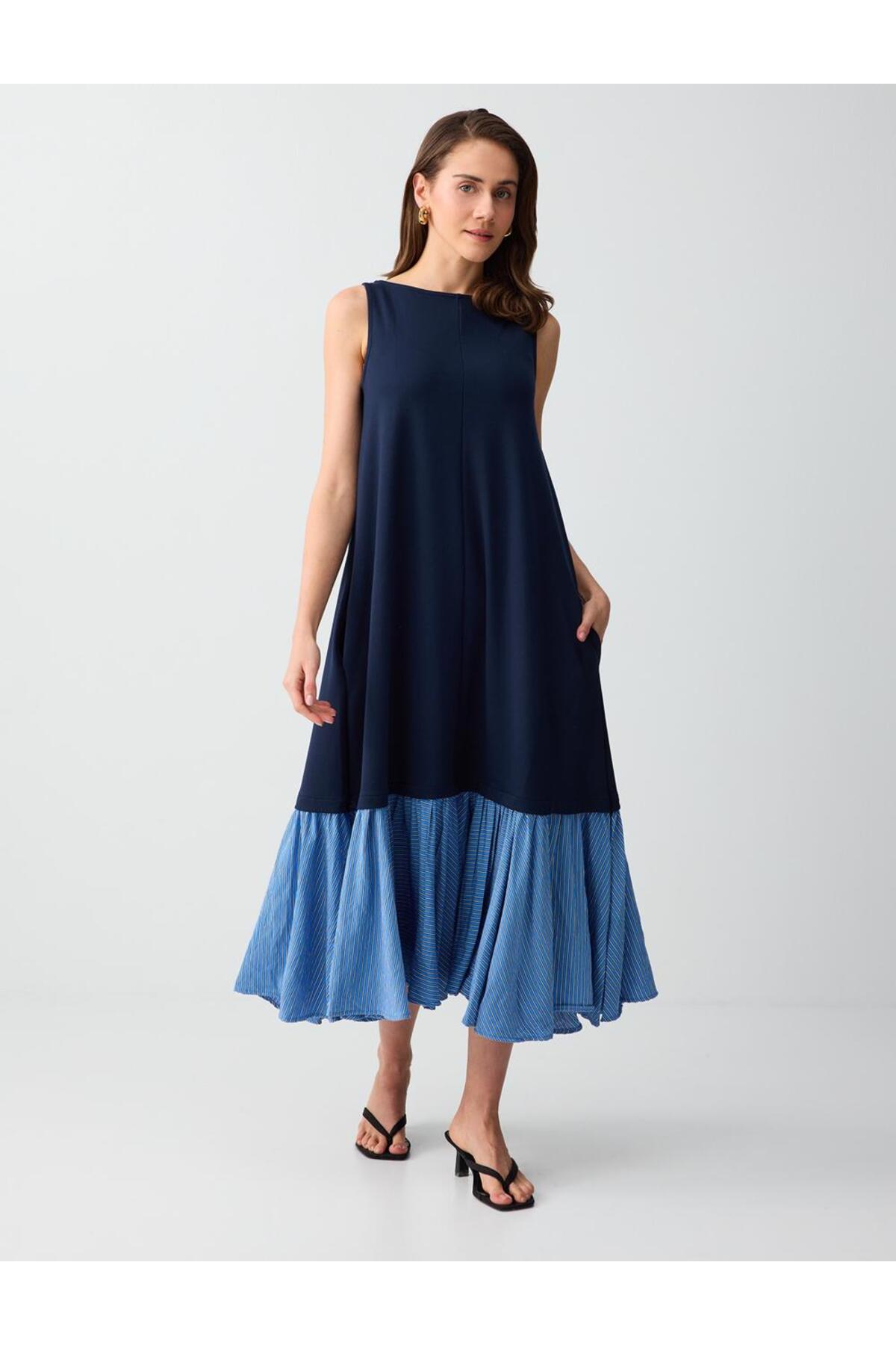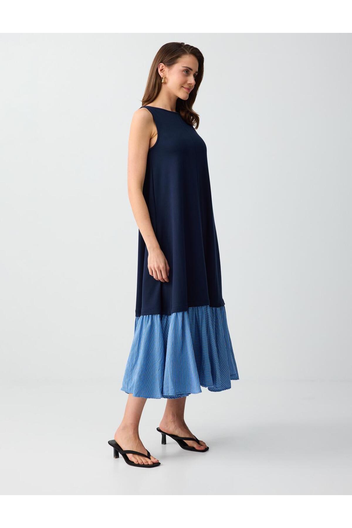 Navy Blue Boat Neck Sleeveless Color Block Knitted Midi Dress