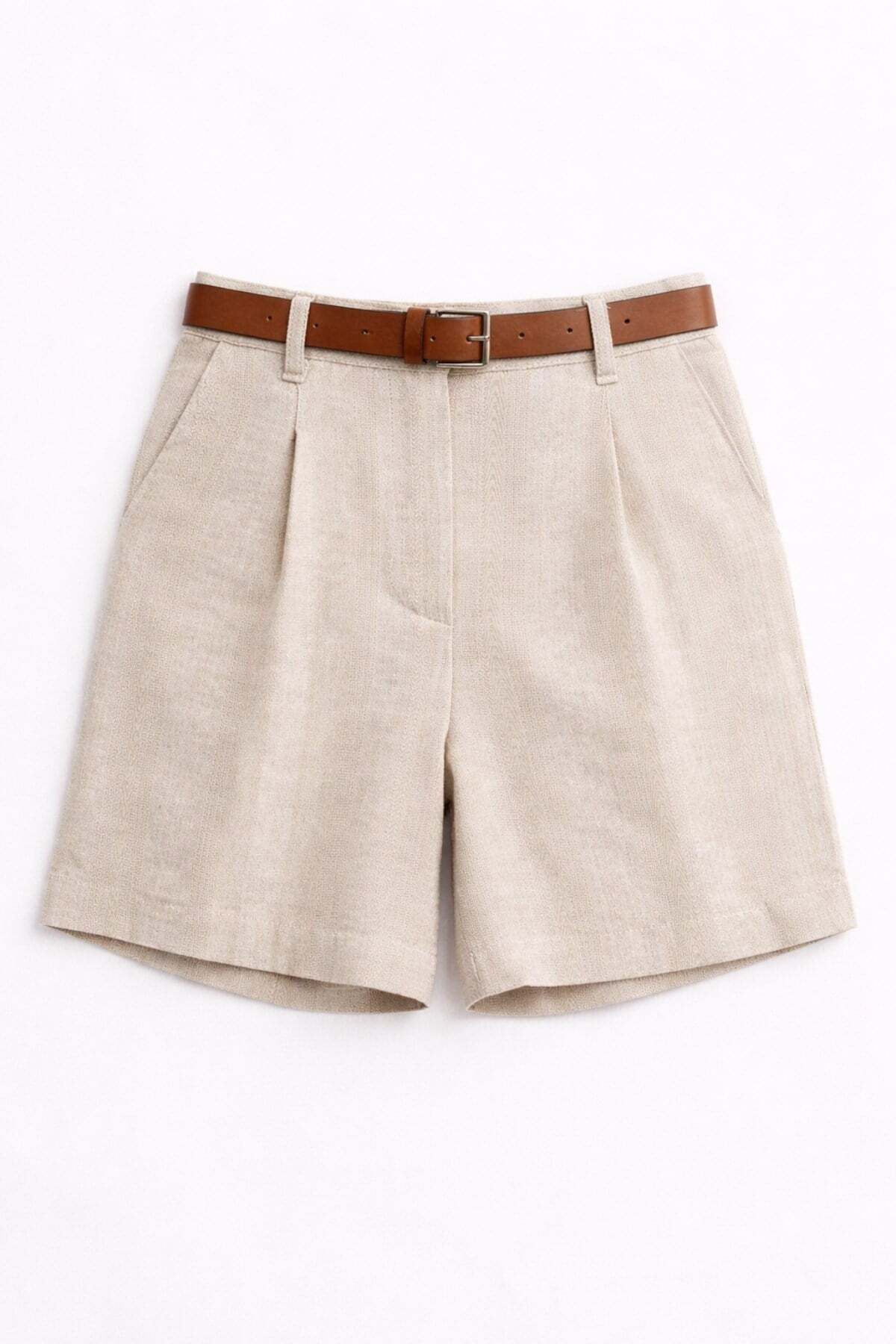 40222 Women's High Waist Leather Belted Pleated Shorts Natural