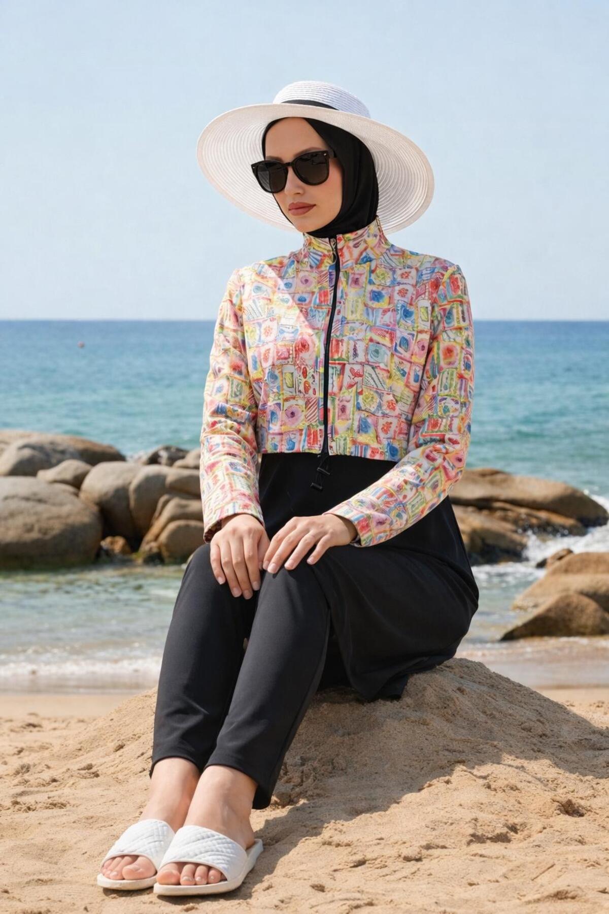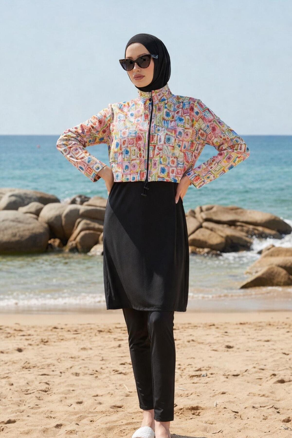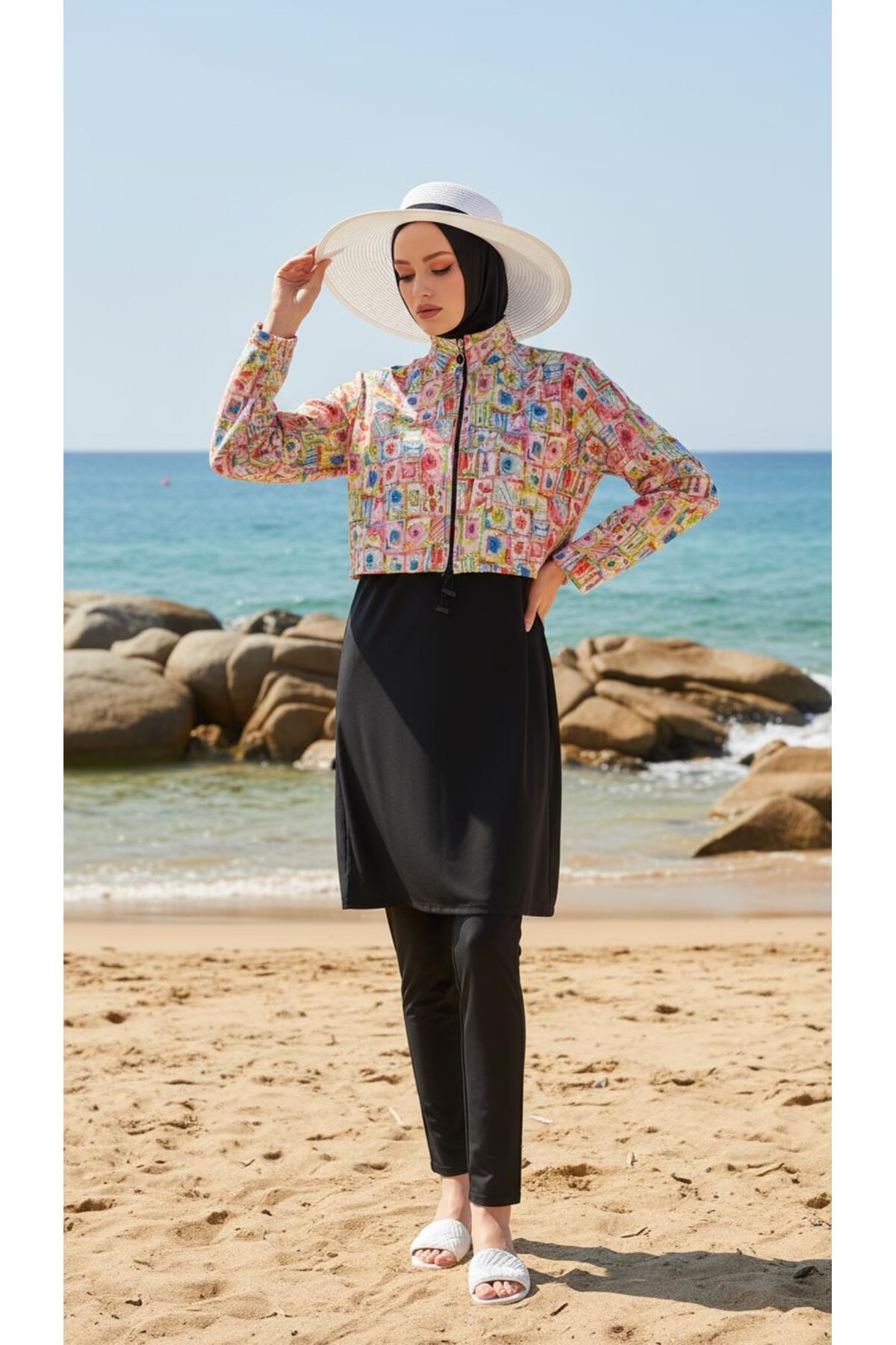 Offering an eye-catching look with ethnic patterns, the full-closed hijab swimsuit completes your elegance at the beach in summer.