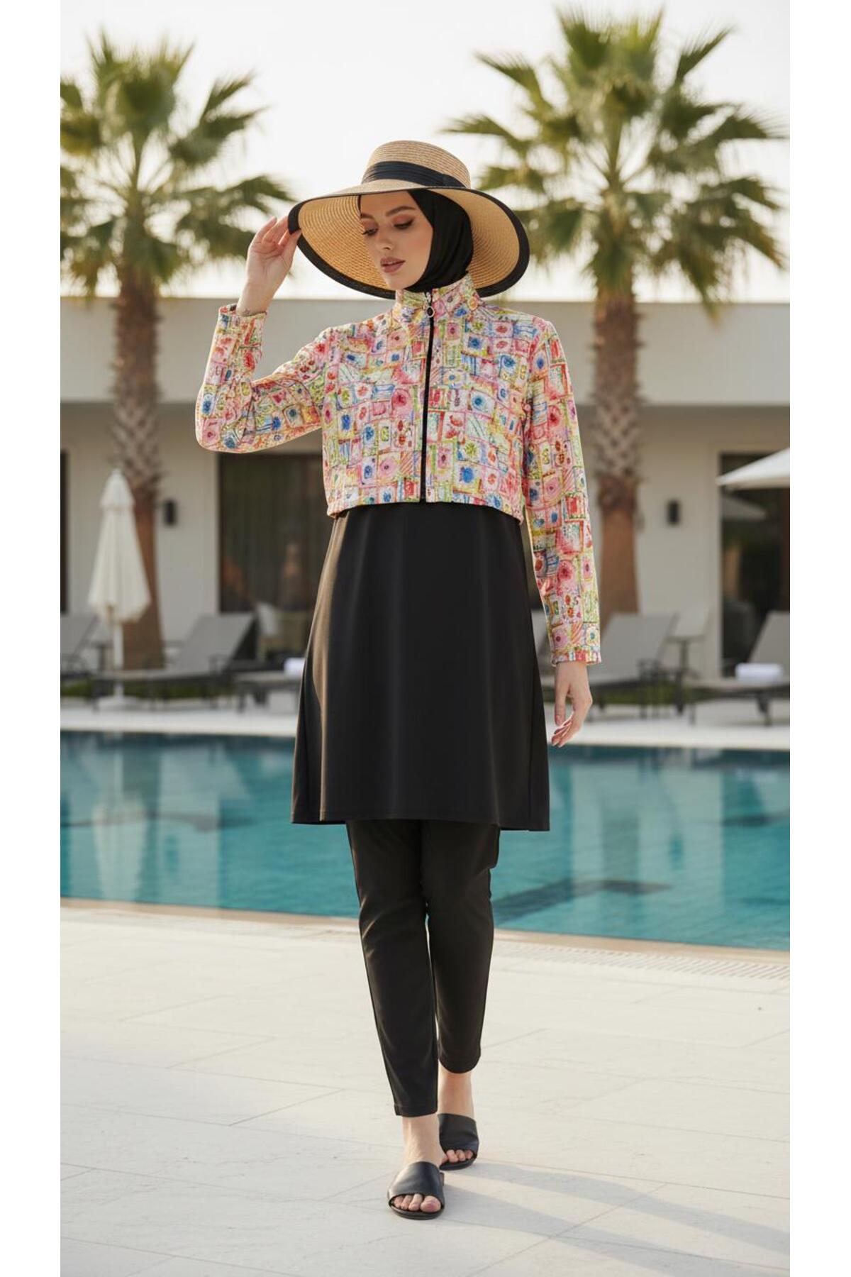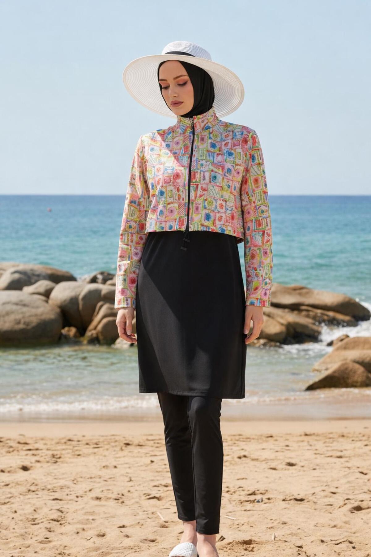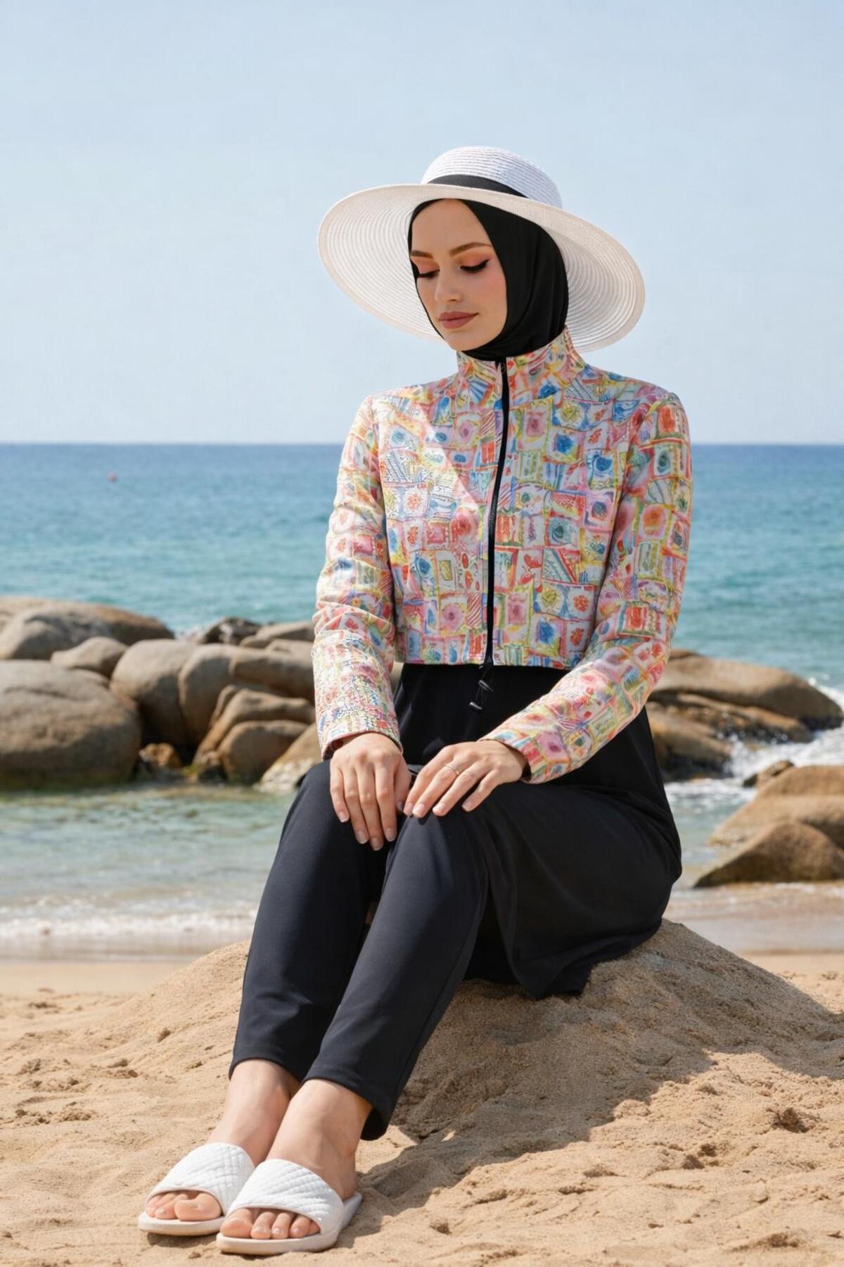 Offering an eye-catching look with ethnic patterns, the full-closed hijab swimsuit completes your elegance at the beach in summer.