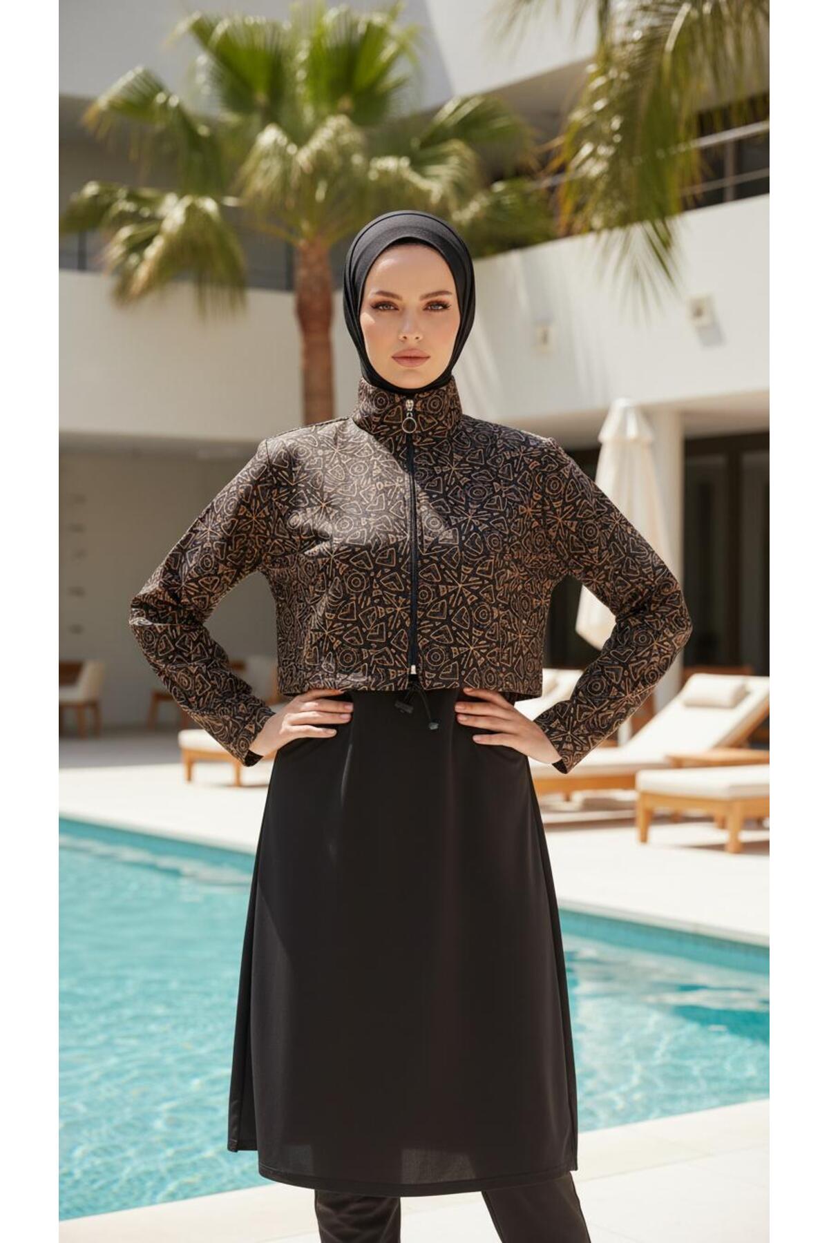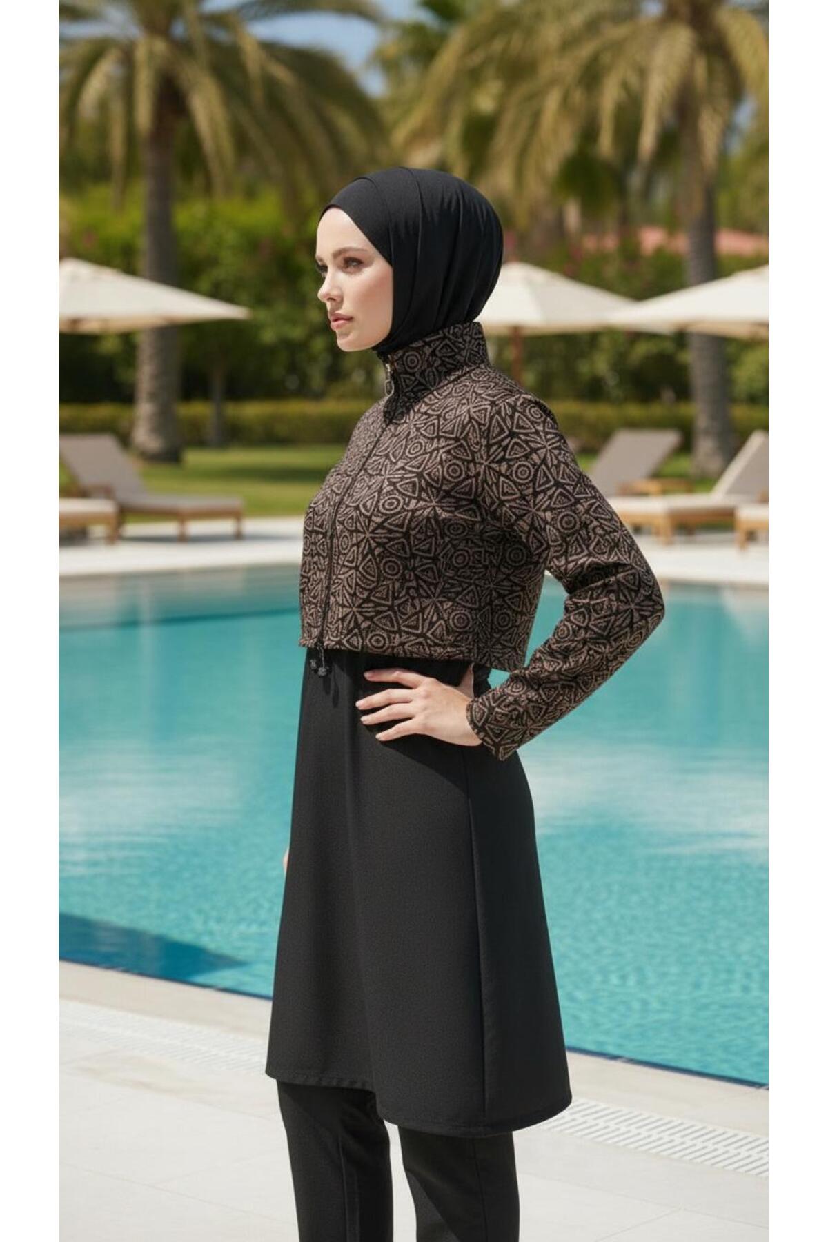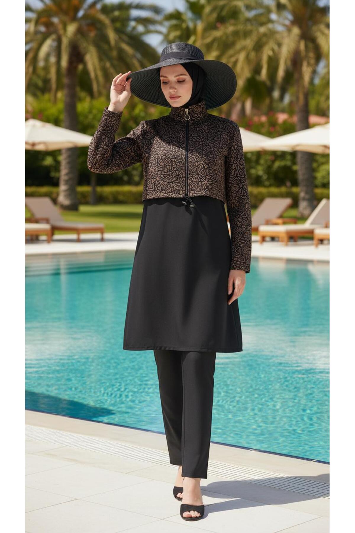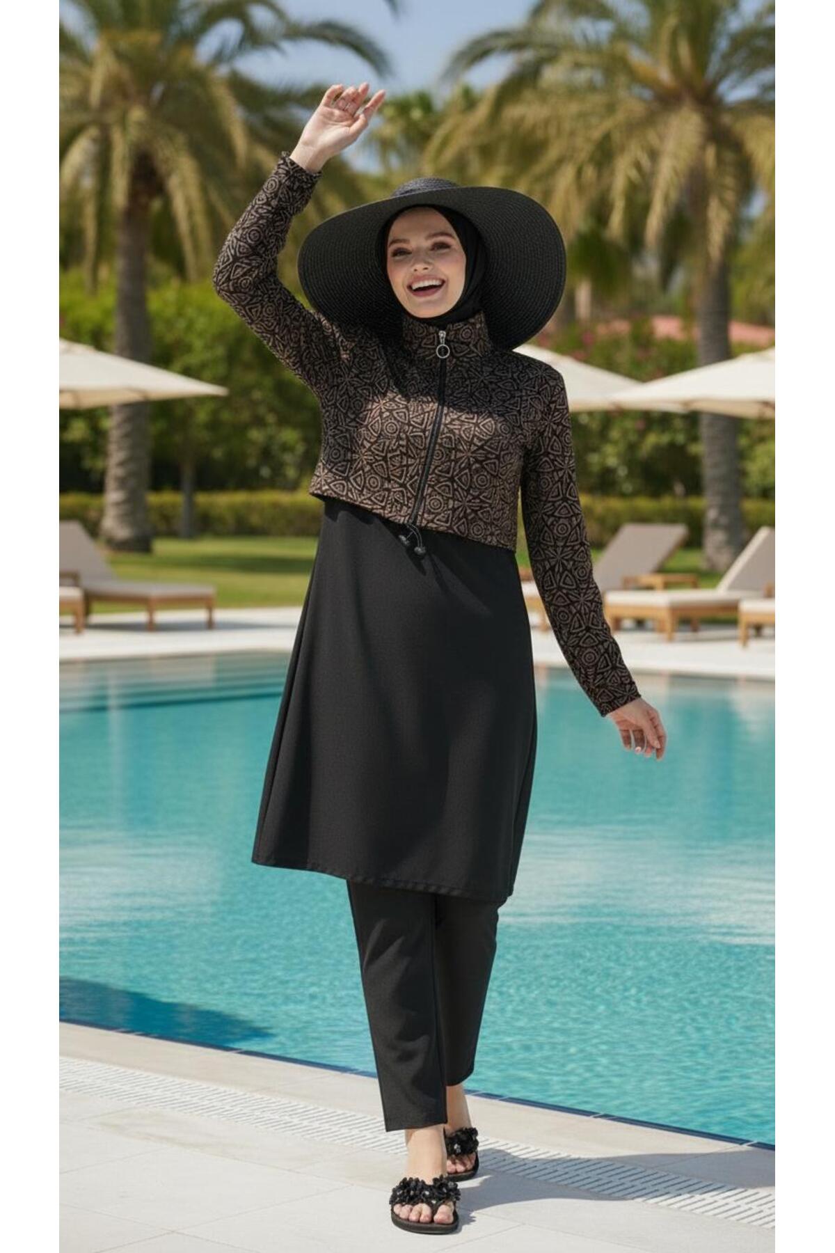 Offering an eye-catching look with ethnic patterns, the full-closed hijab swimsuit completes your elegance at the beach in summer.
