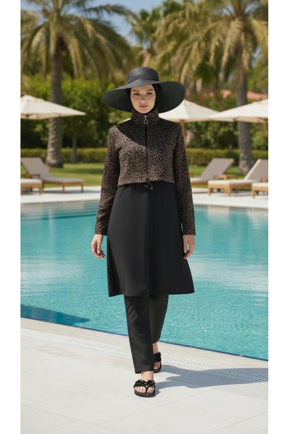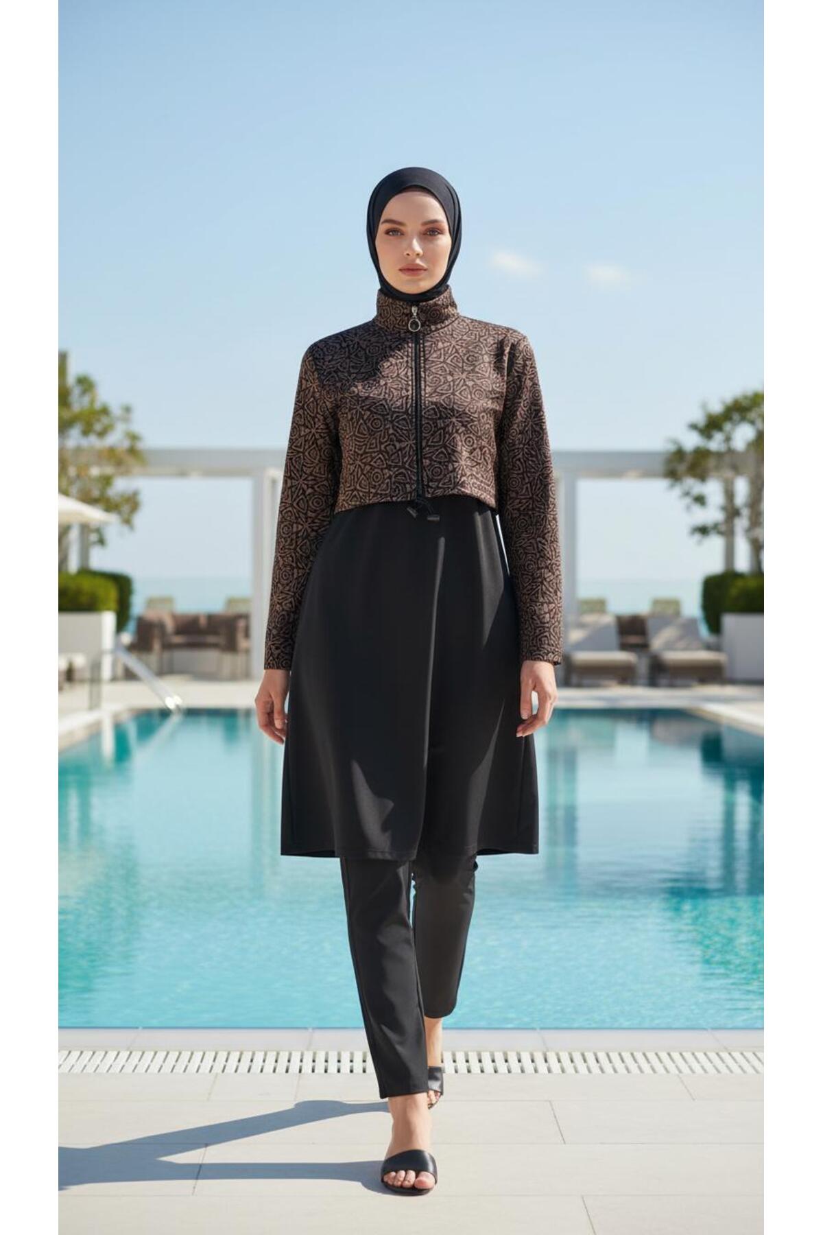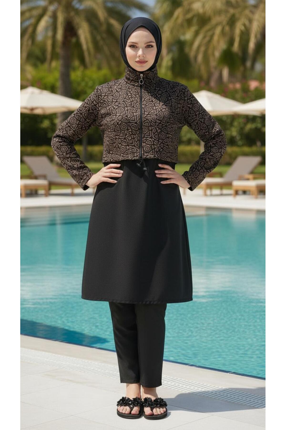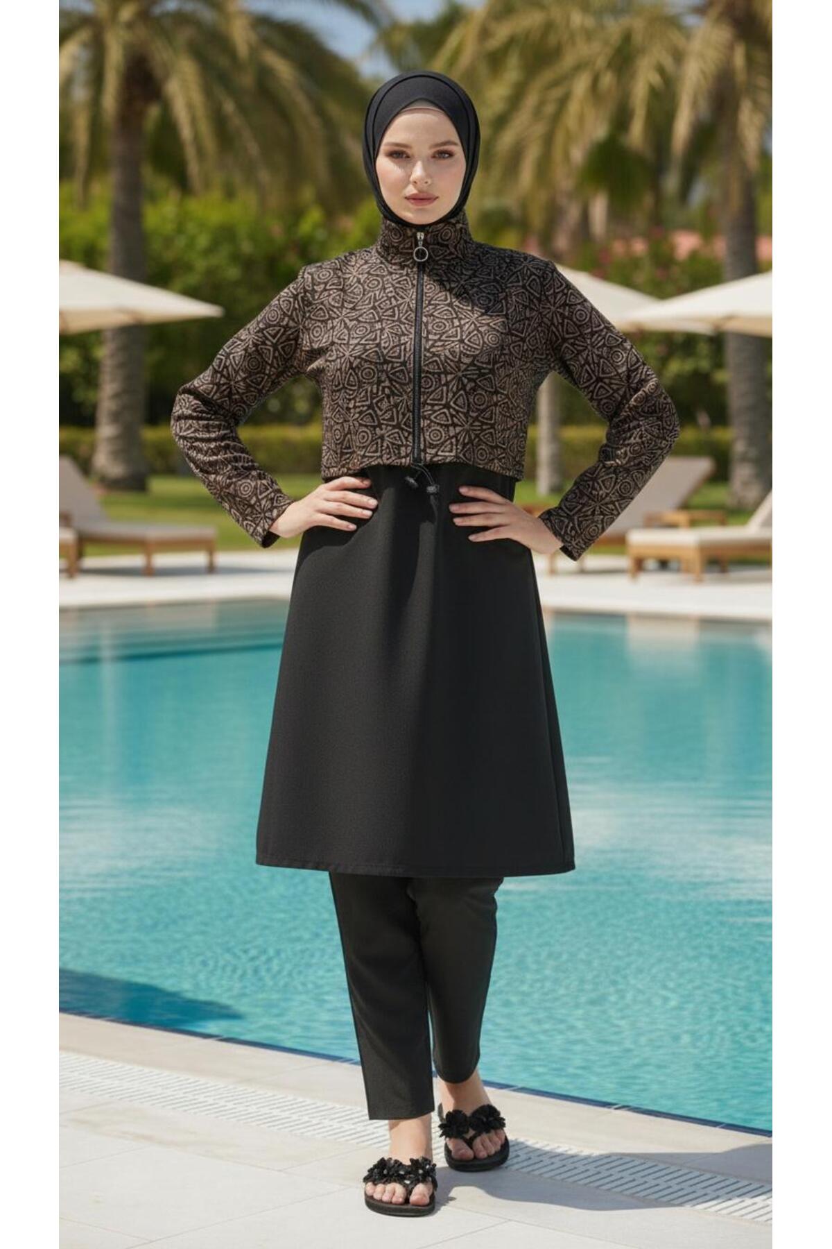 Offering an eye-catching look with ethnic patterns, the full-closed hijab swimsuit completes your elegance at the beach in summer.