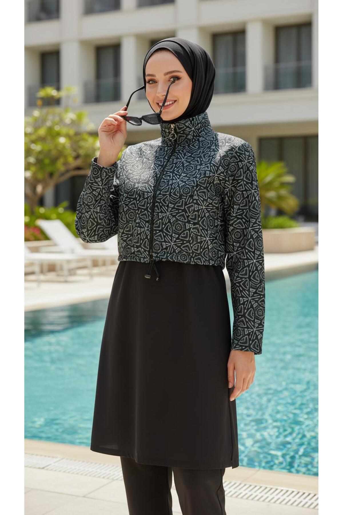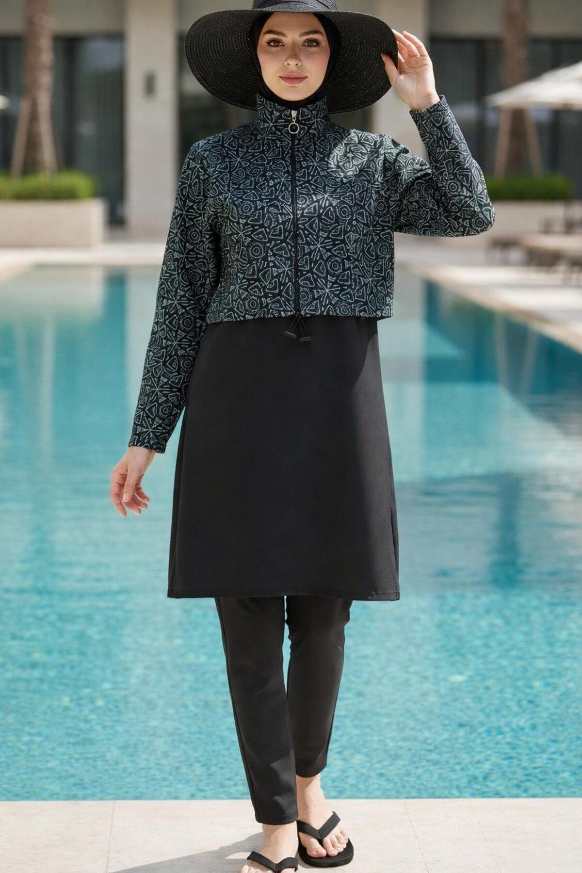 Offering an eye-catching look with ethnic patterns, the full-closed hijab swimsuit completes your elegance at the beach in summer.