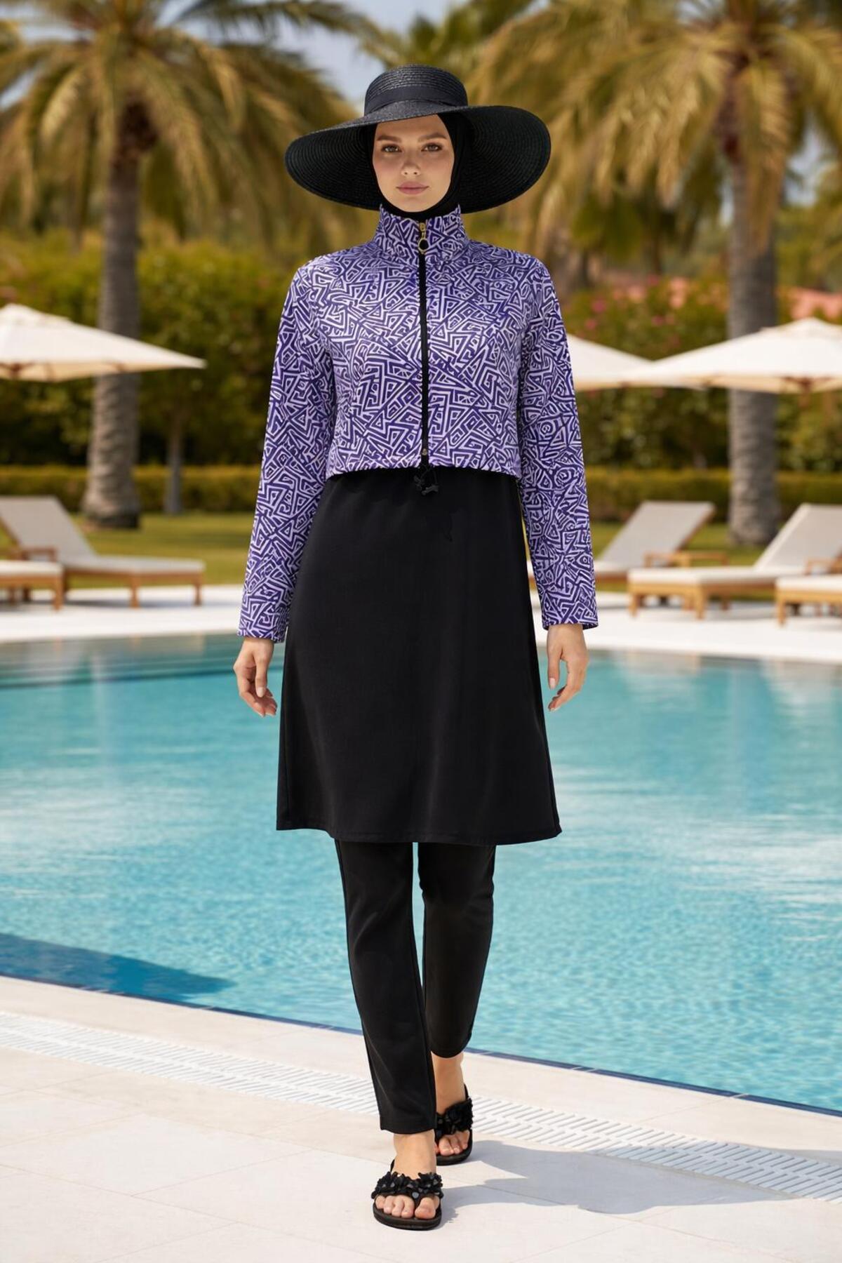 Offering an eye-catching look with ethnic patterns, the full-closed hijab swimsuit completes your elegance at the beach in summer.