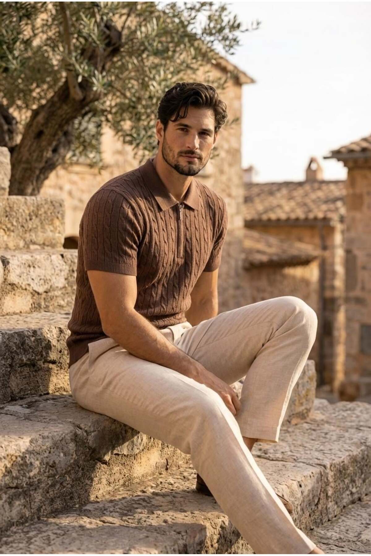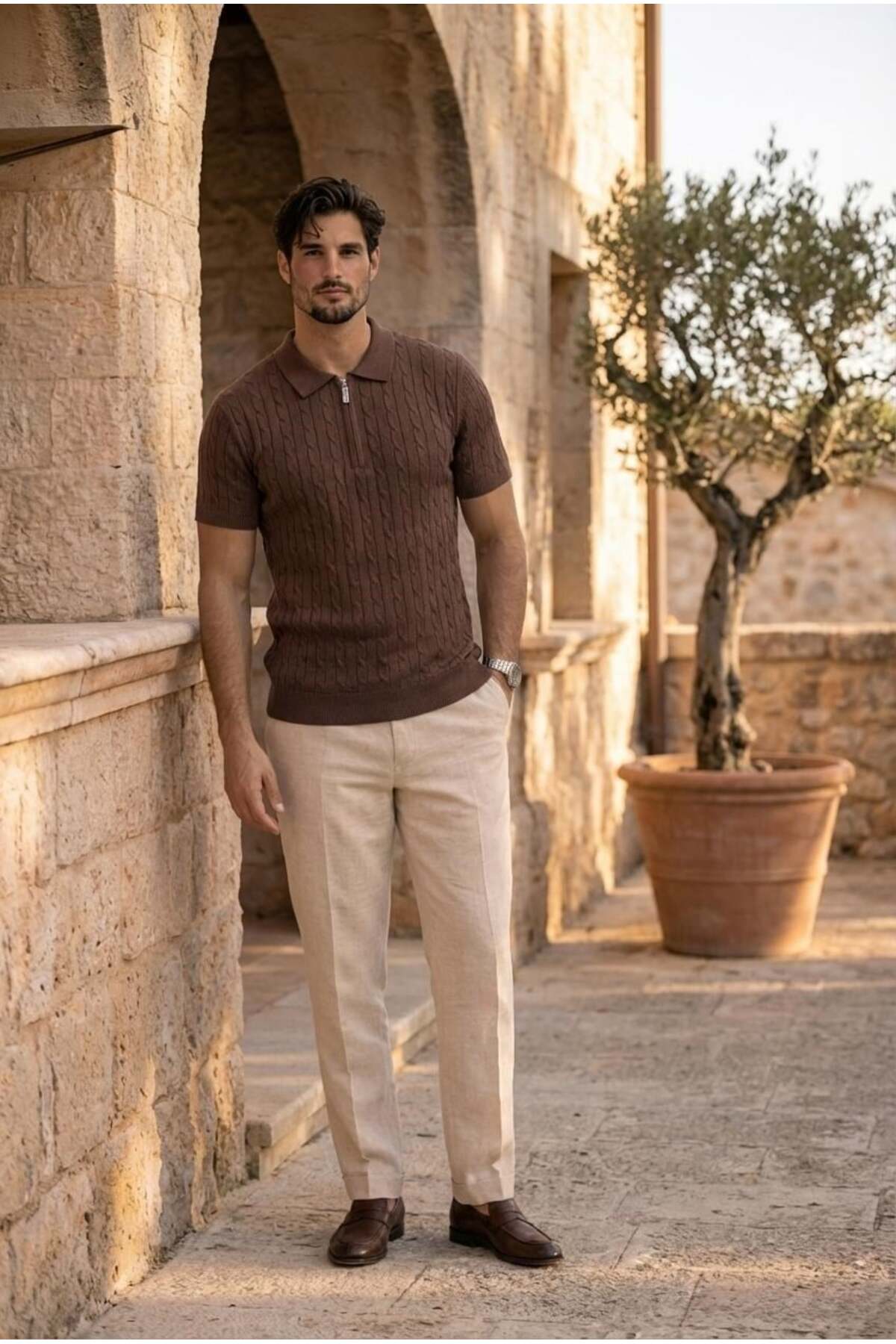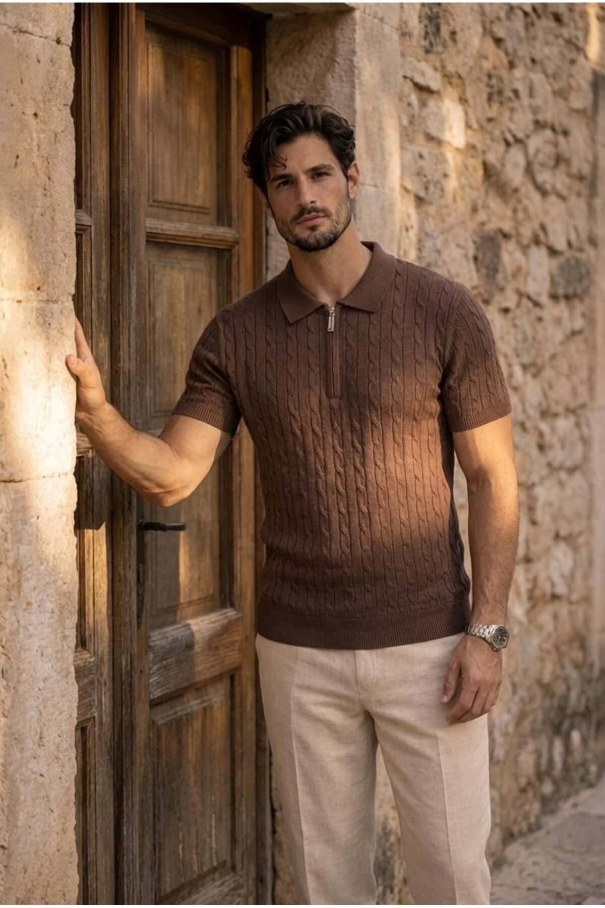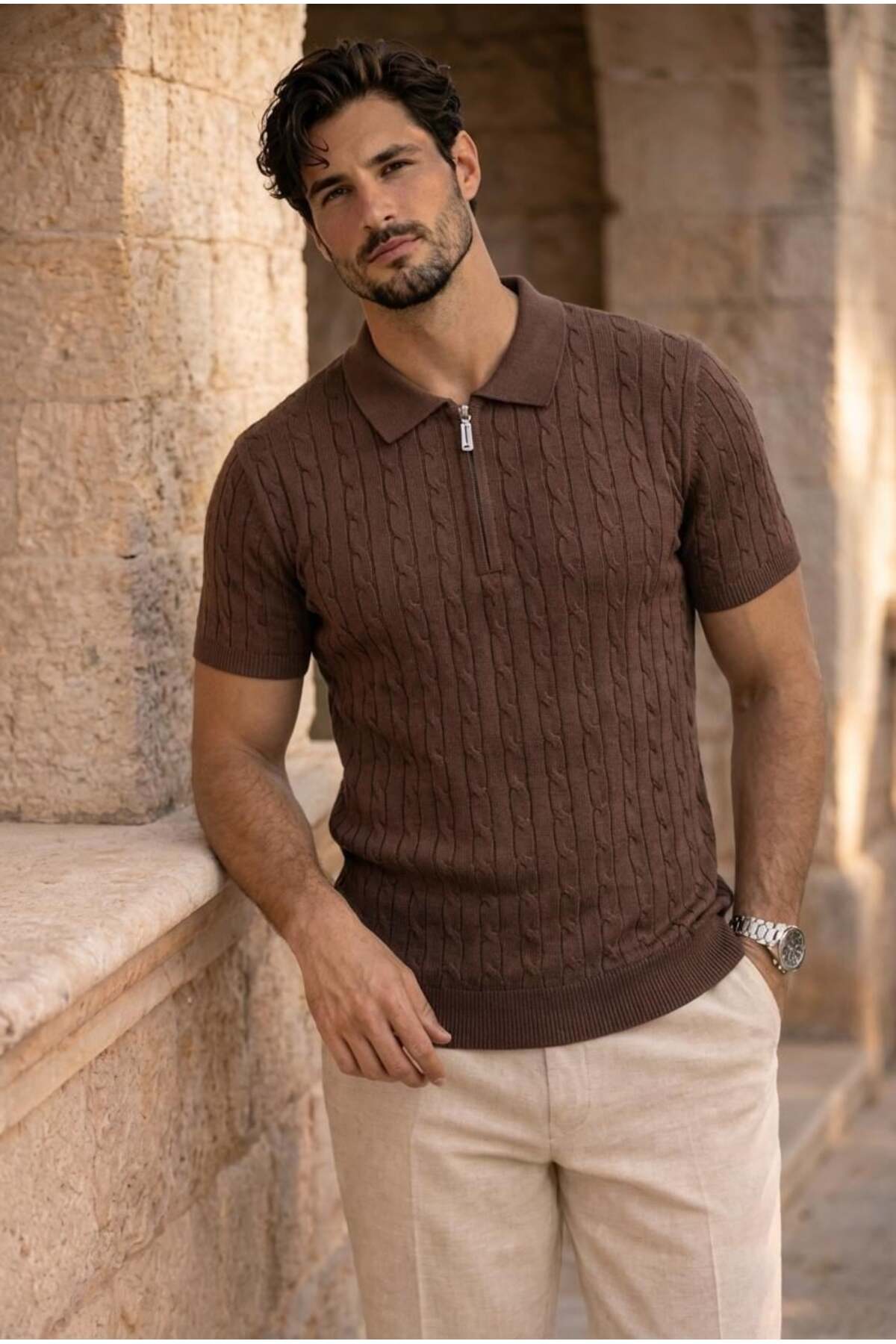 Product Information Fabric: Thin Knitwear – Hair Weave Textured Content: 75% Cotton, 25% Polyamide Collar: Half Zippered Sleeve: Short Sleeve Sizes: S / M/L / XL Colors: Black, Navy, Beige, Burgundy, Ecru Pattern: Regular – casual cut Season: Spring / Summer
