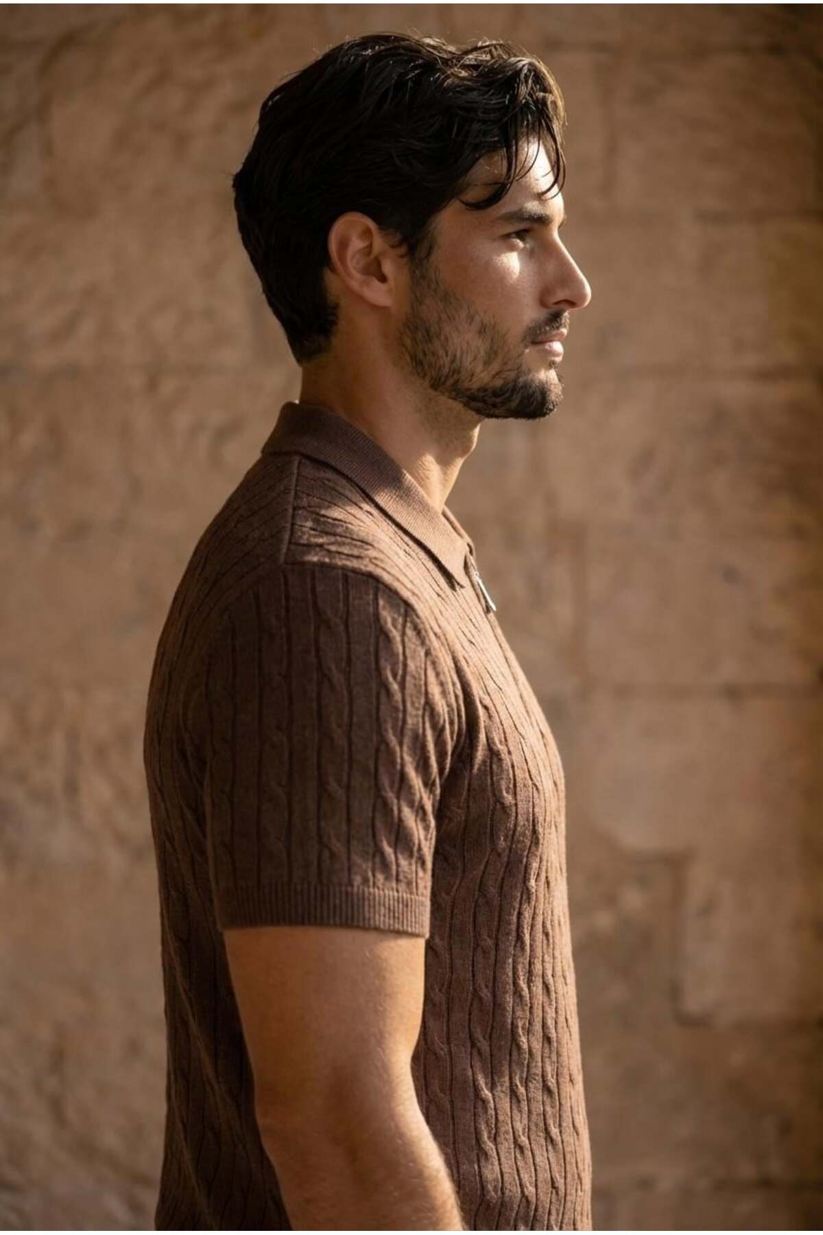 While it differs from the classic t-shirt look thanks to its fine knitwear structure with hair weave texture, its half zippered collar detail gives it a modern and strong style.