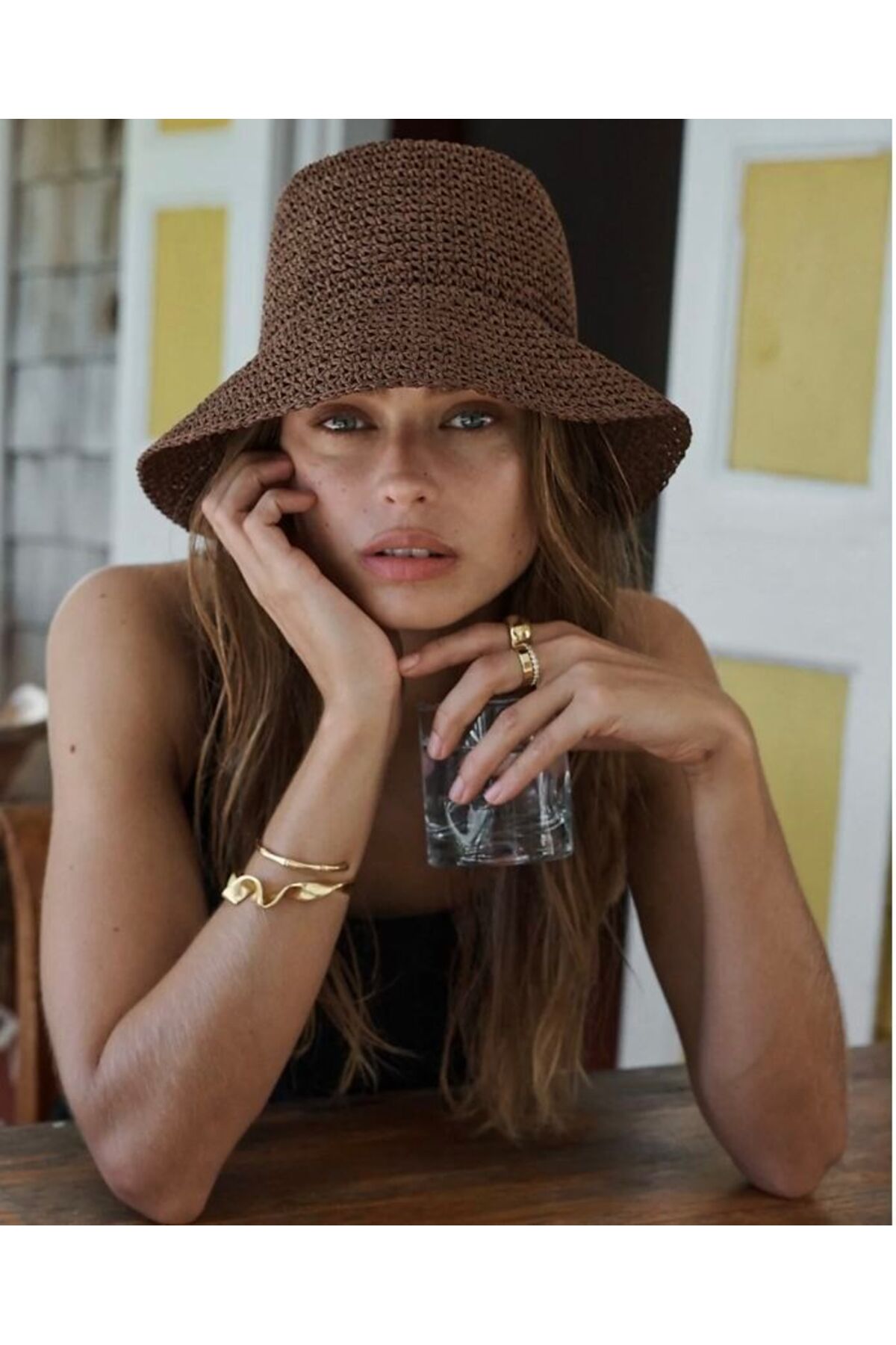 Complete your elegance with a brown imported hand-knitted straw hat, which is an indispensable part of the summer months.