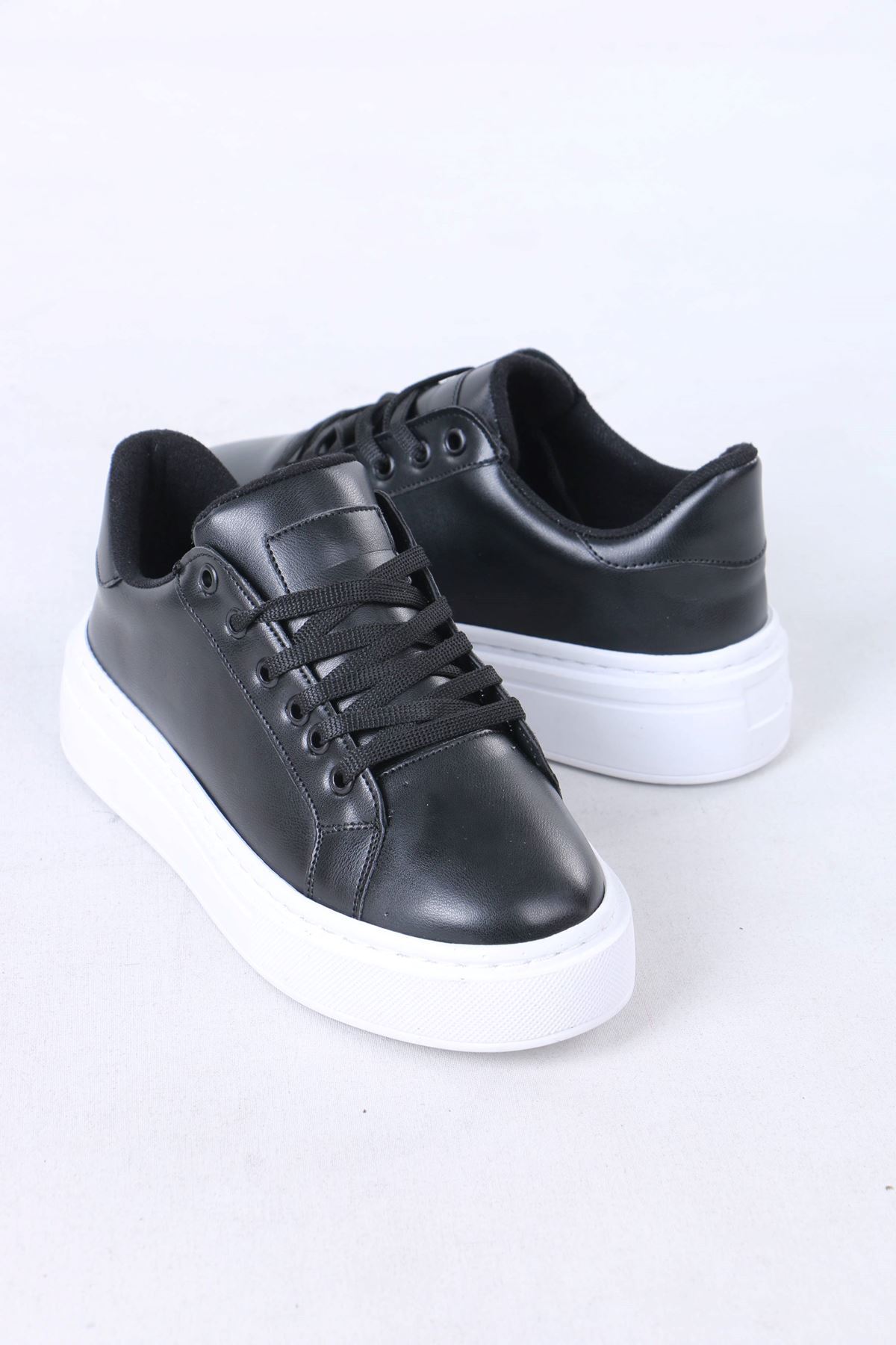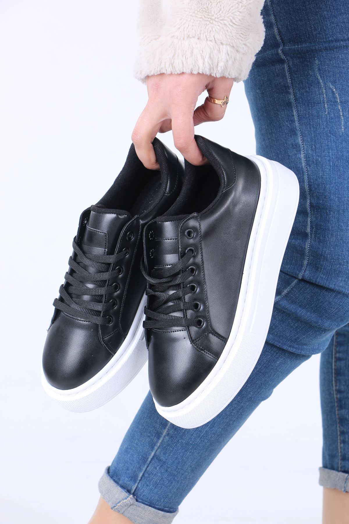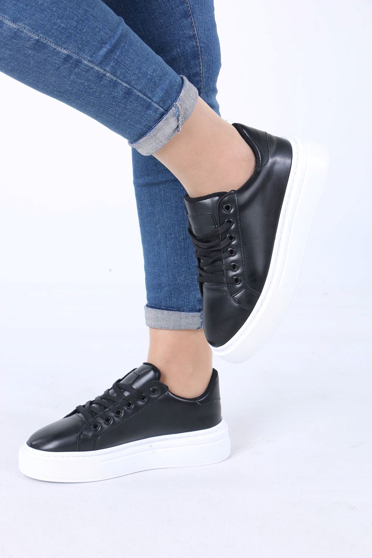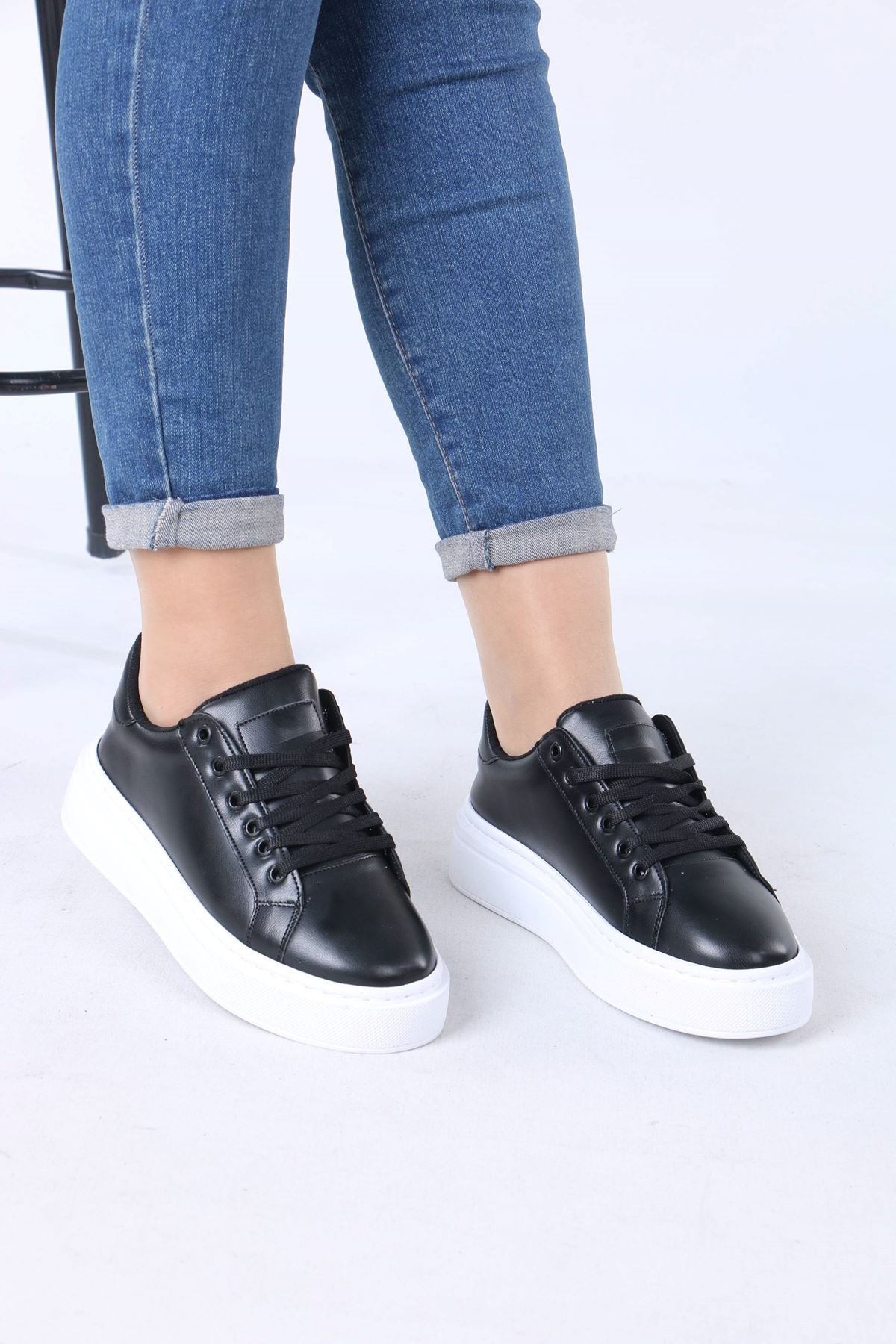 sefayol Jeri Black White Sole Matte Leather Lace-Up Women's Sports Shoes | ByTR