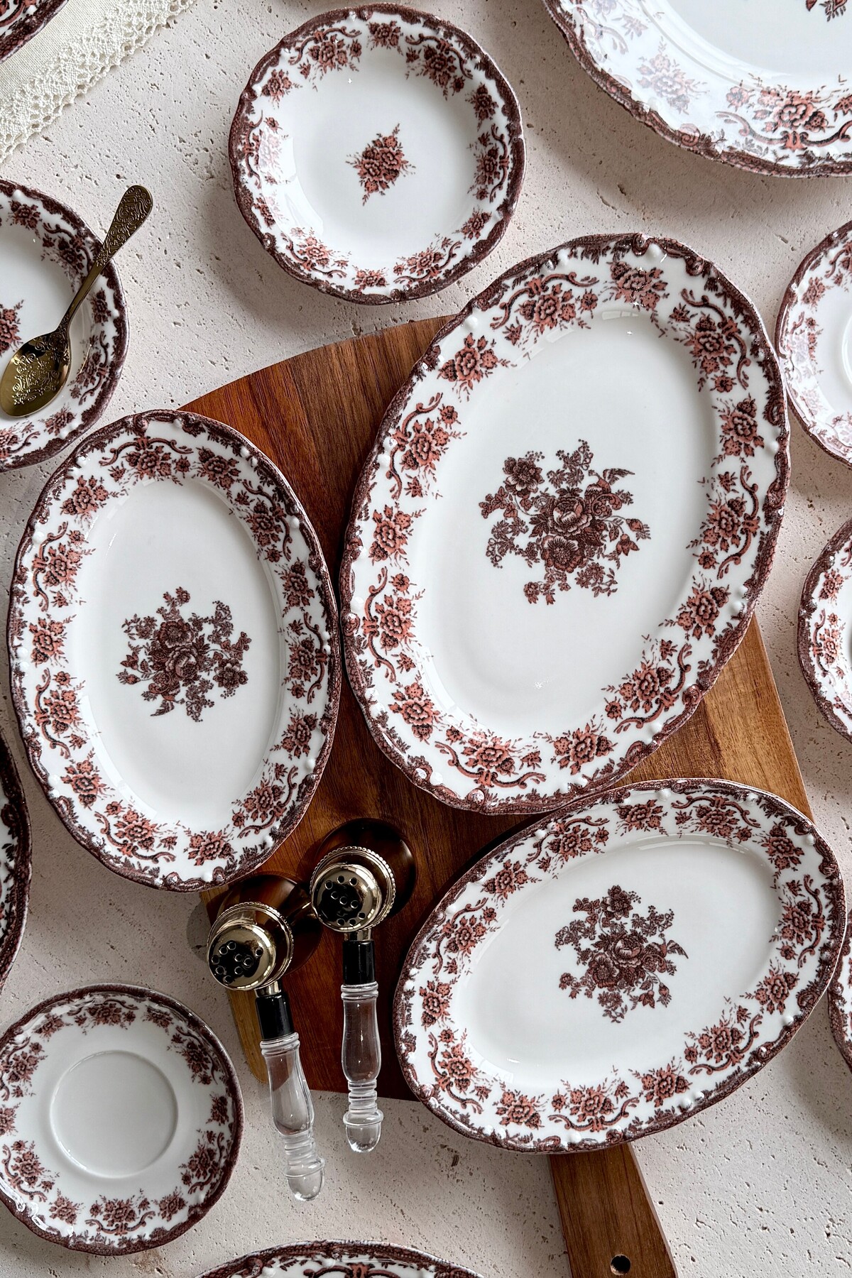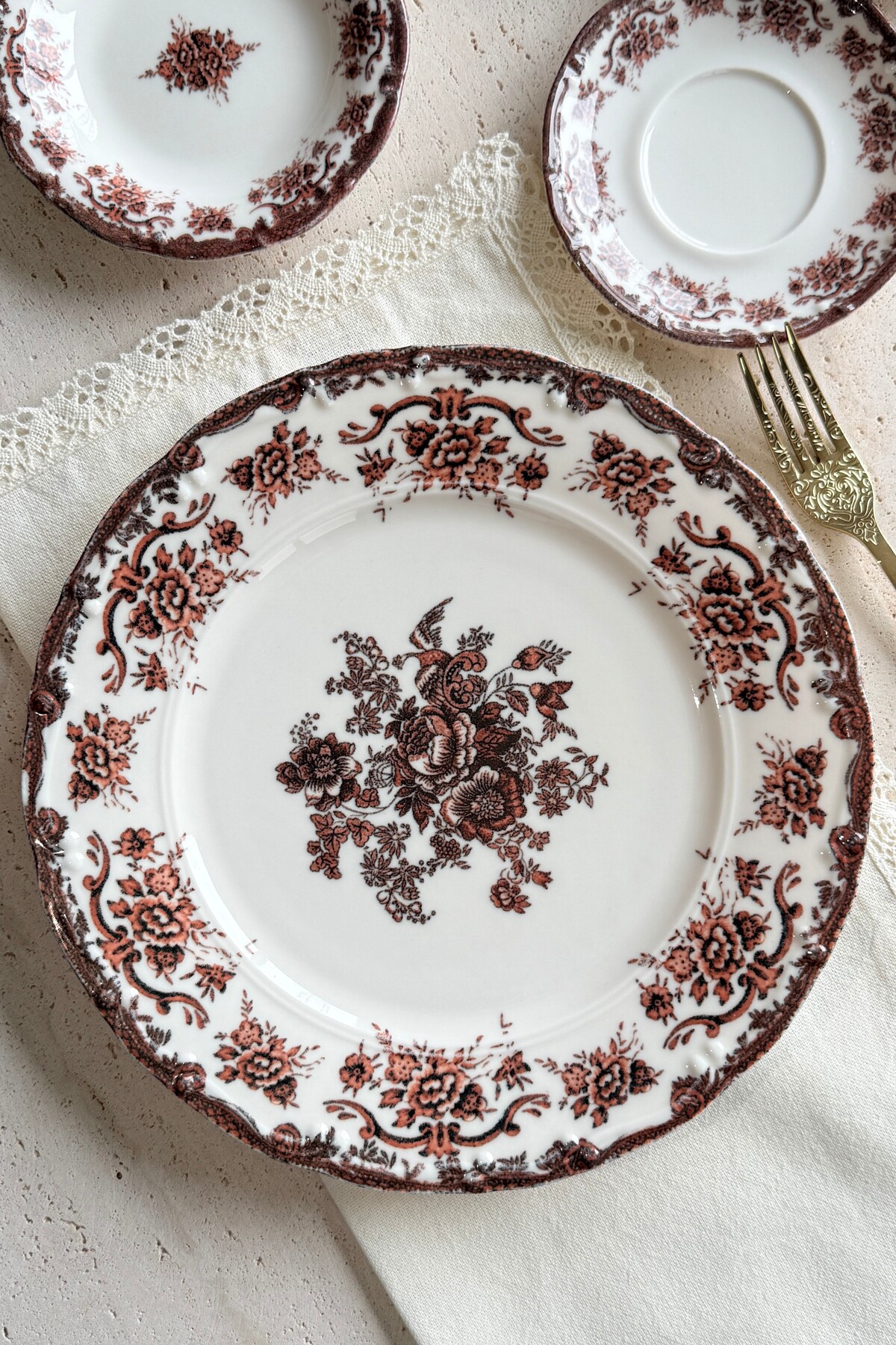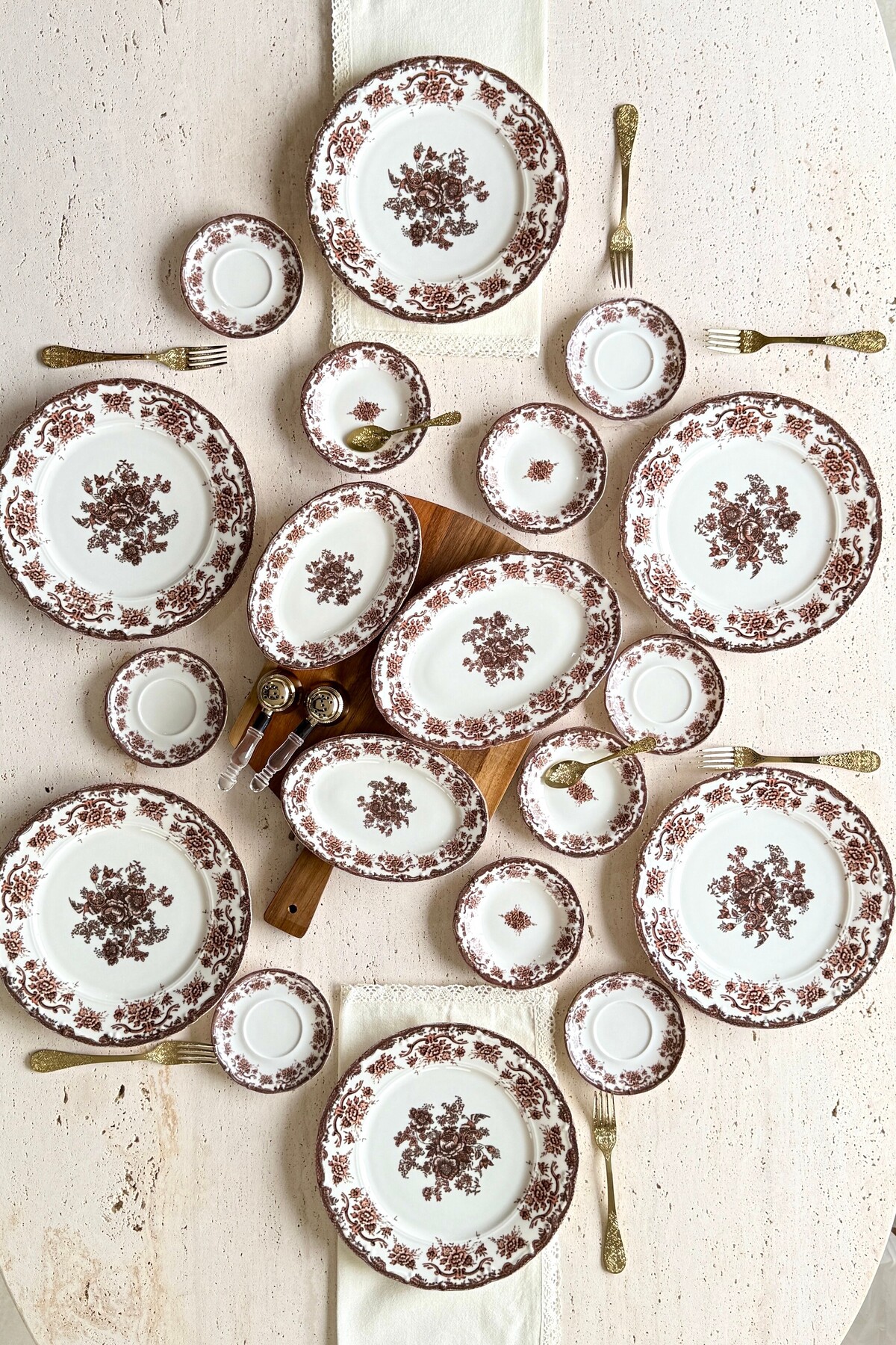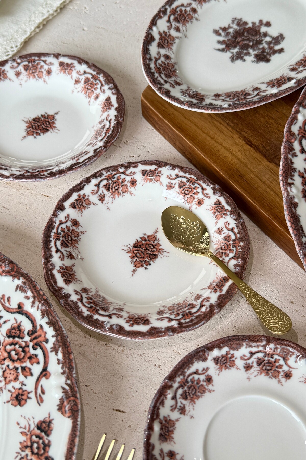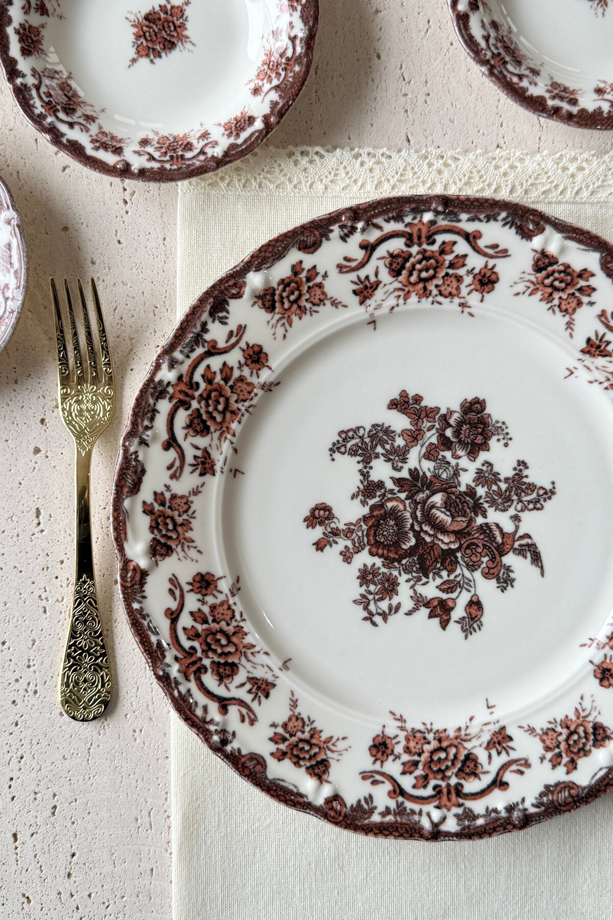 Thanks to this vintage floral model, where burgundy and coffee tones are used together, your breakfast tables will turn into a feast!