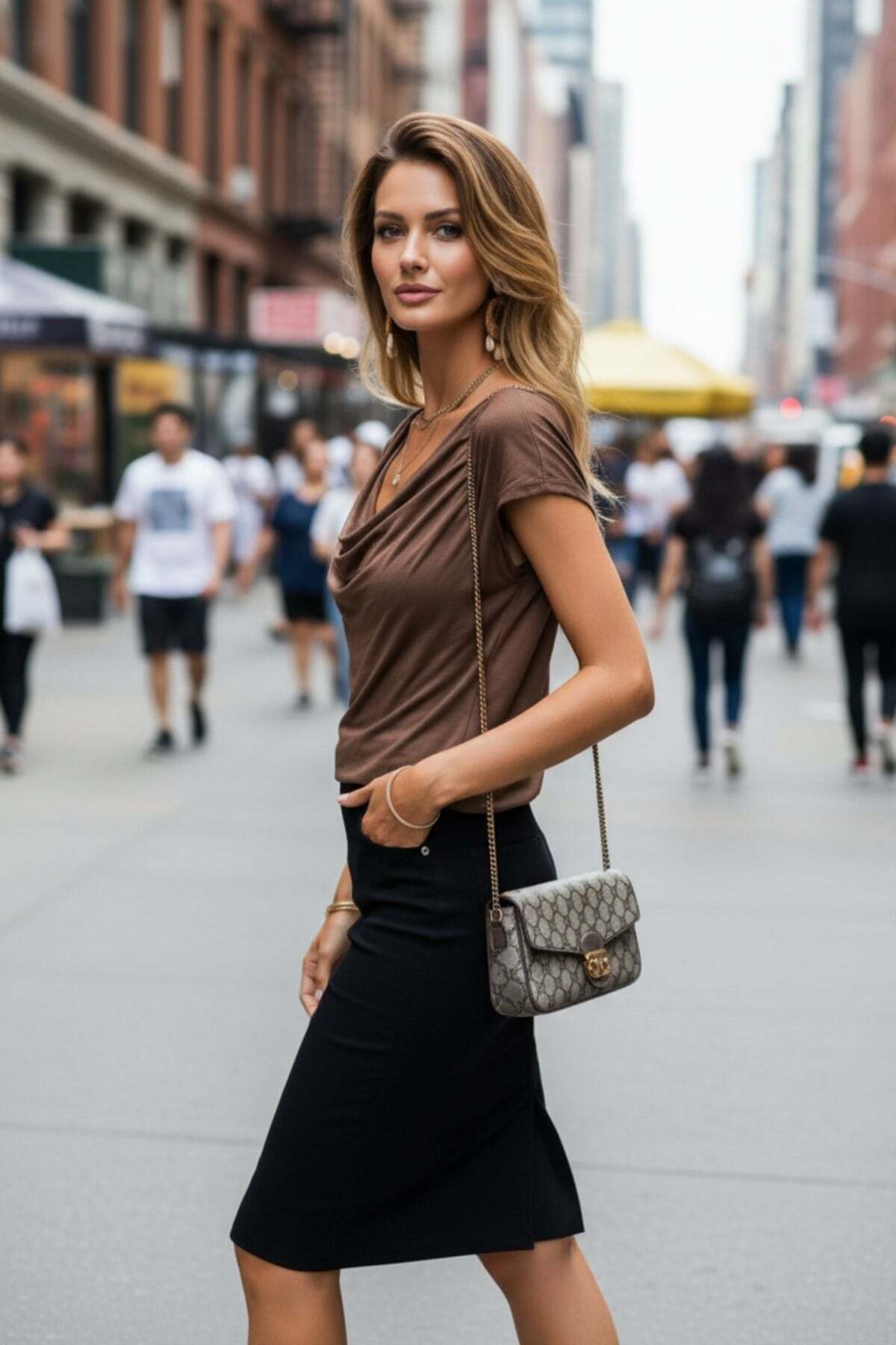 Degage Collar Short Sleeve Flowing Viscose Blouse - Brown