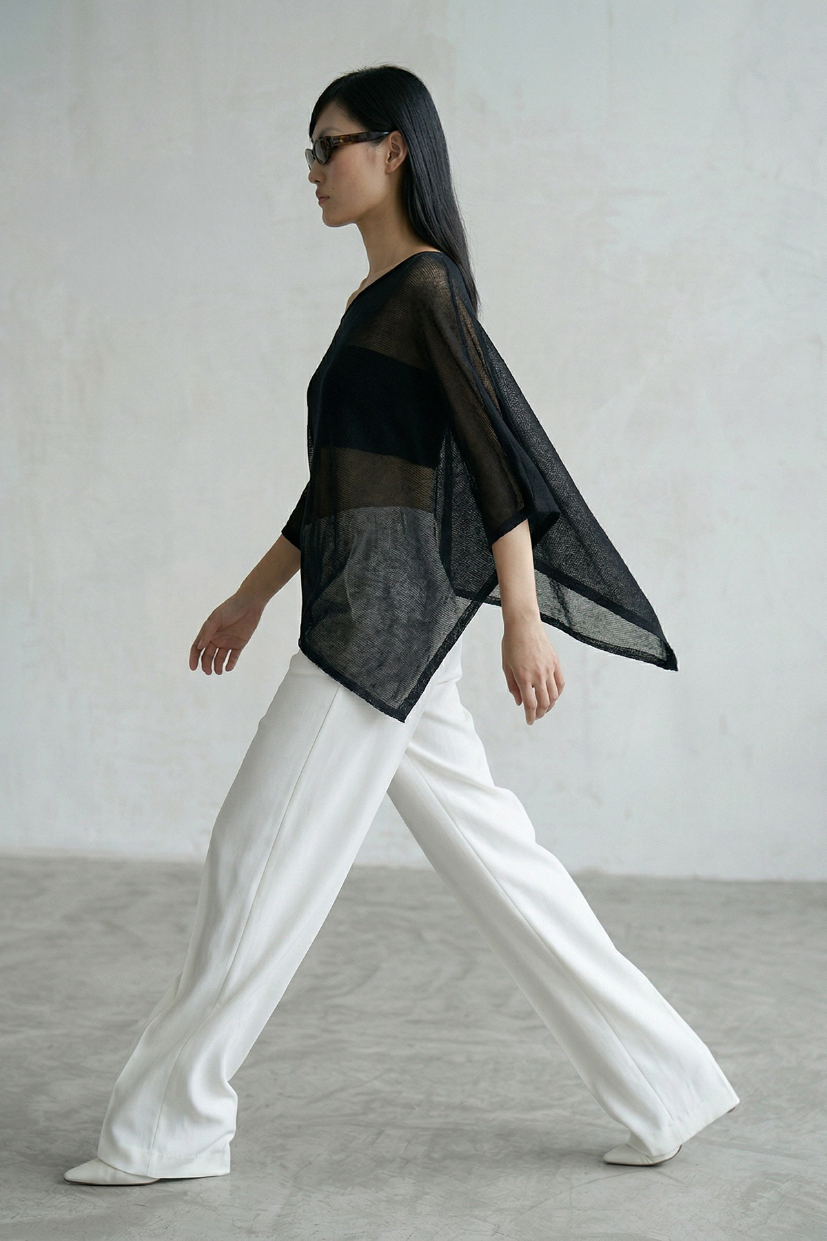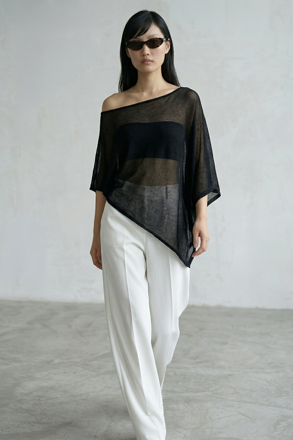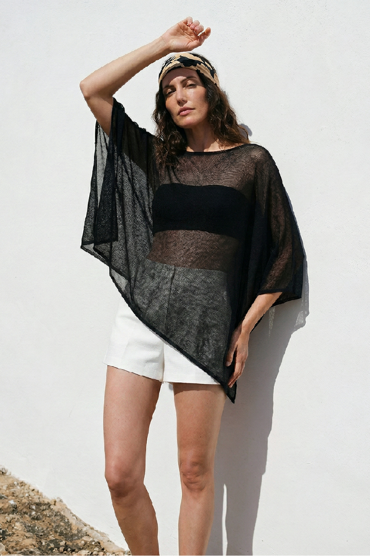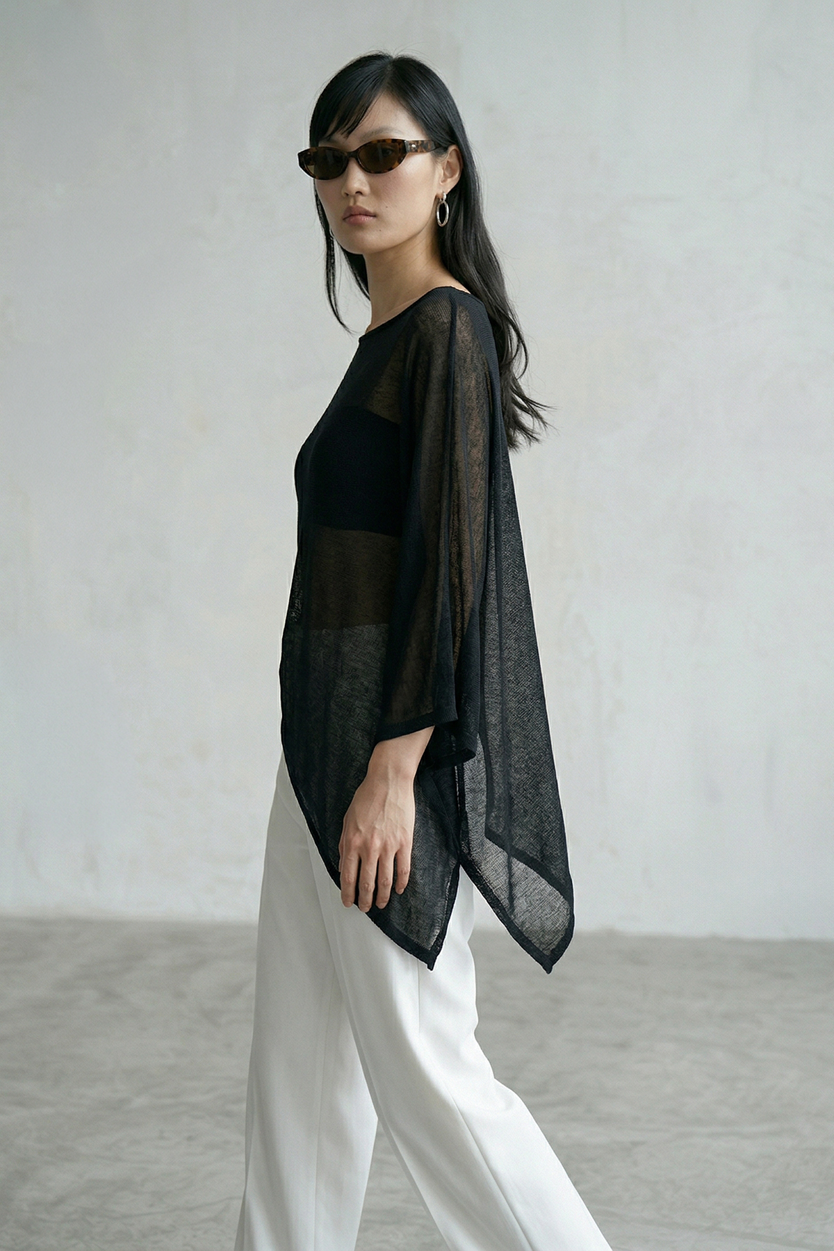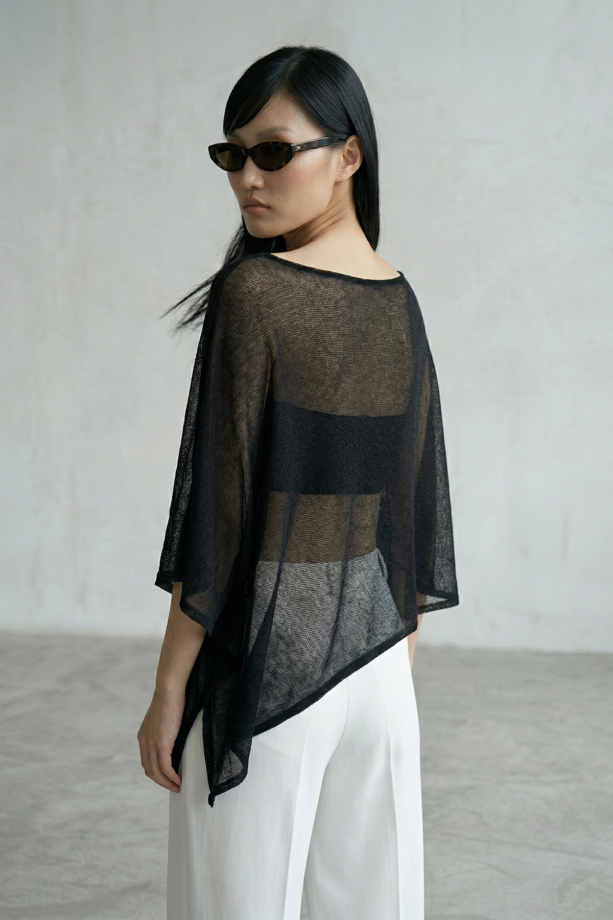 Asymmetrical cut, sleeveless, transparent, knitwear Chuba cape poncho.