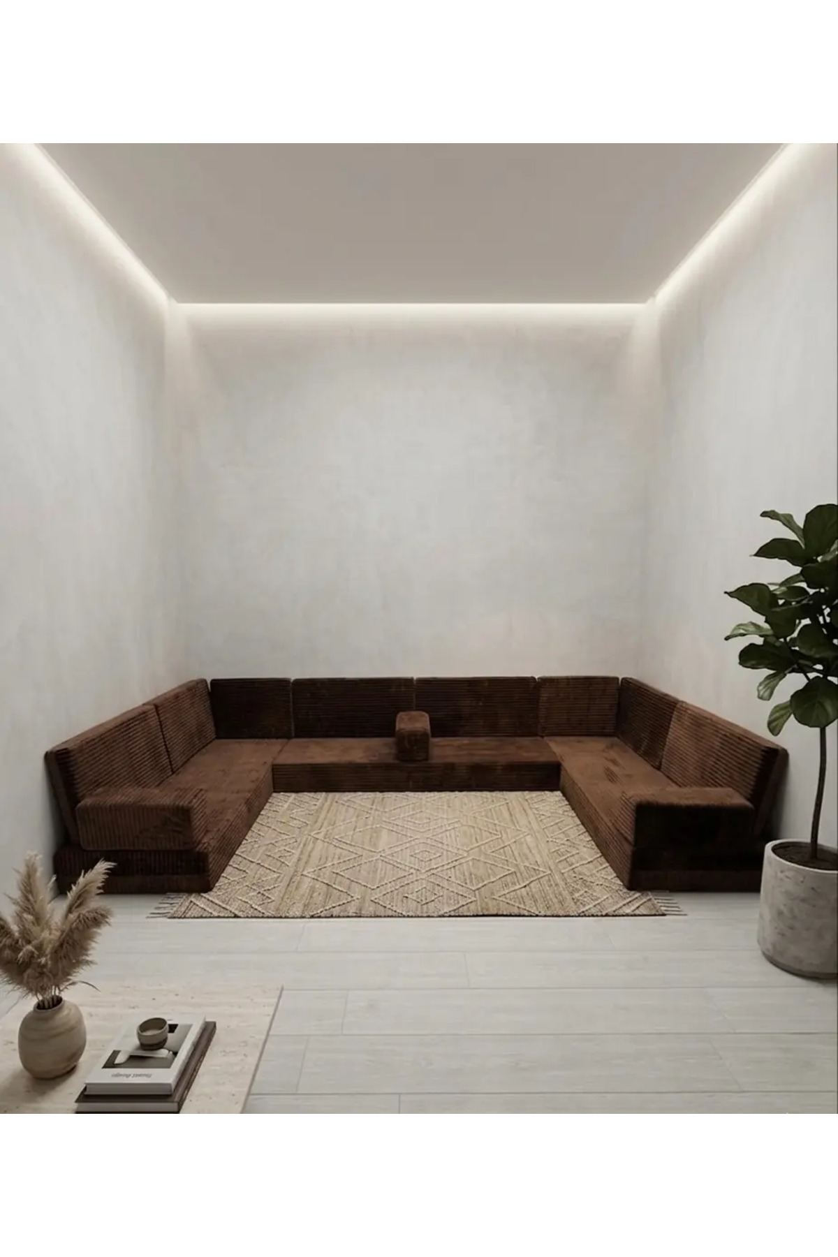 Set Content: It consists of a total of 14 pieces, including 3 Floor Cushions (70 x 190 x 20 cm) 6 Back Cushions, (42 x 95 x 10 cm) 3 Armrests (20 x 20 x 50 cm) 2 intermediate back cushions (42 x 60 x 10 cm).