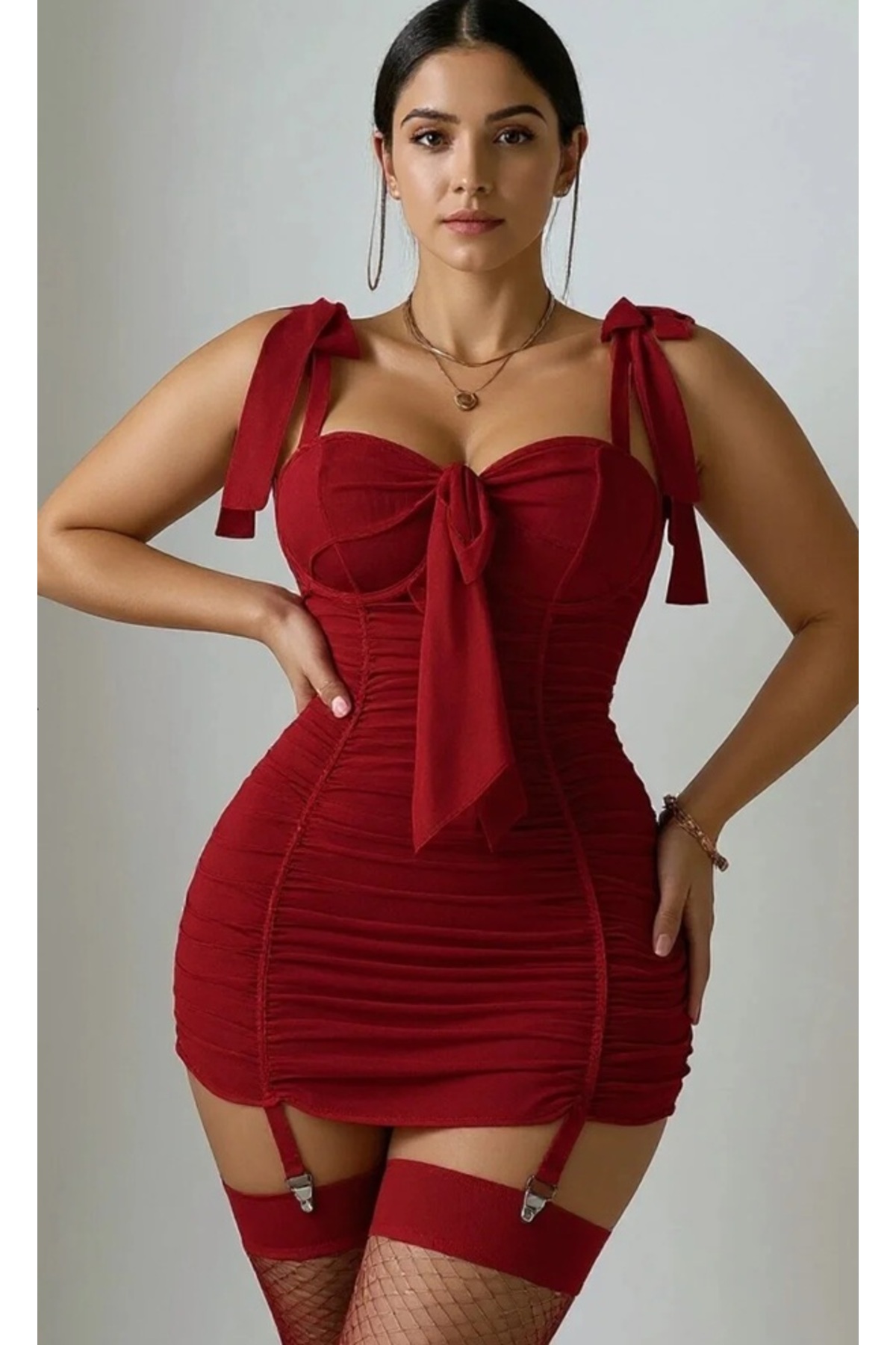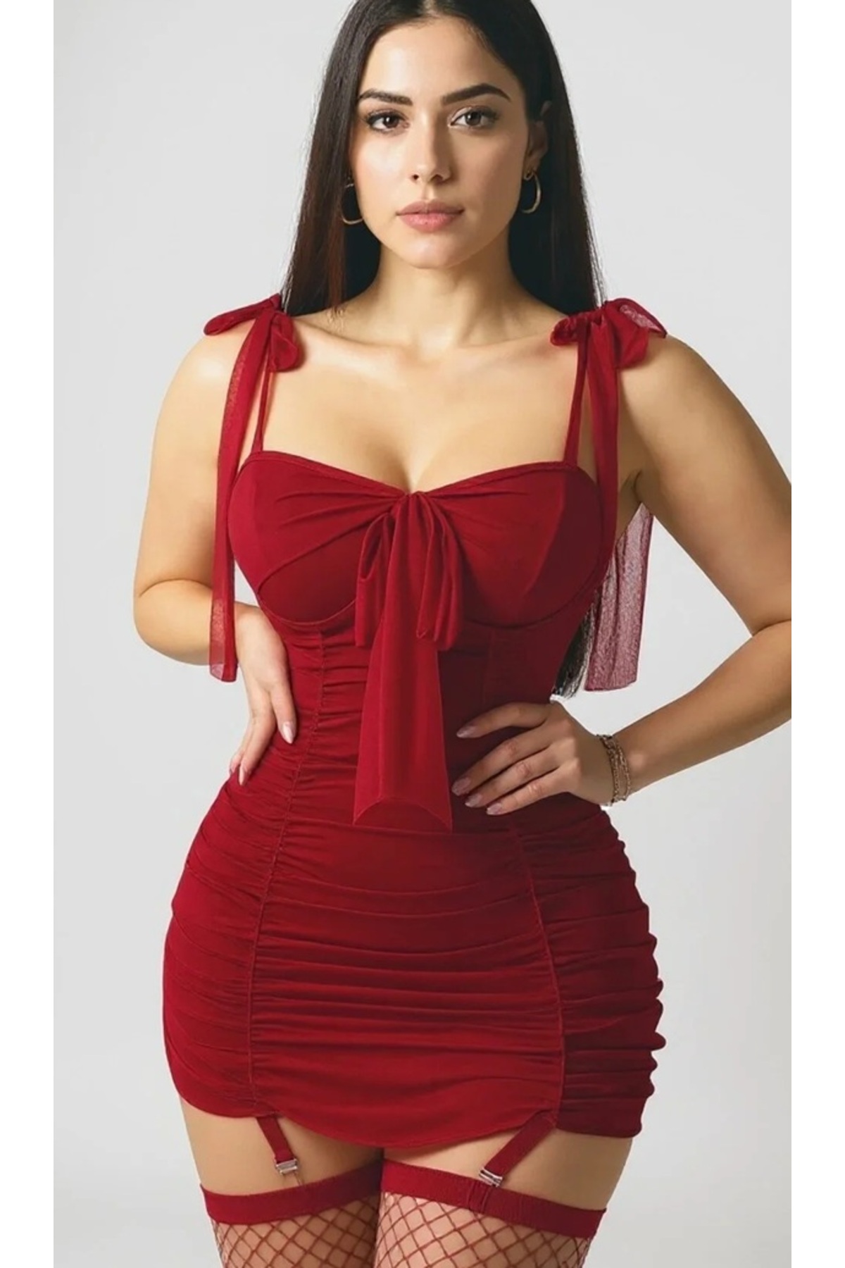 Women's Claret Red Shirred Mini Stylish Dress Suit with Socks Gift - This mini dress, which attracts attention with its claret color, offers elegance and comfort together.