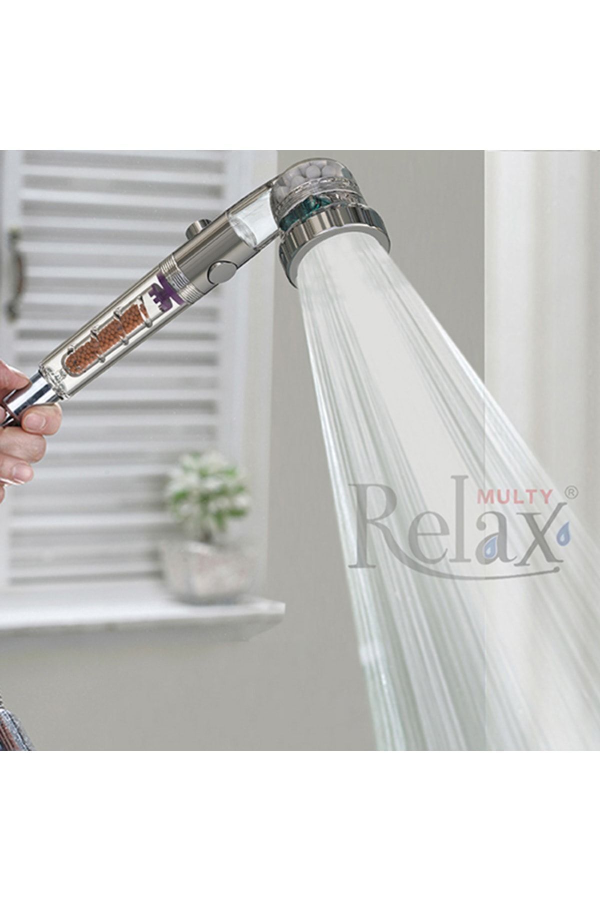 Relax Multy Three Function, On-Off Button Adjustable Turbo Filter Mineral Saving High Pressure Shower Head.