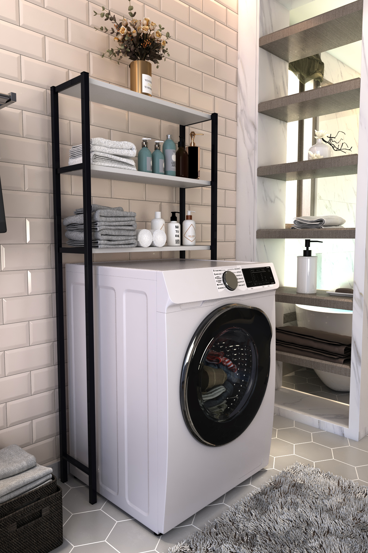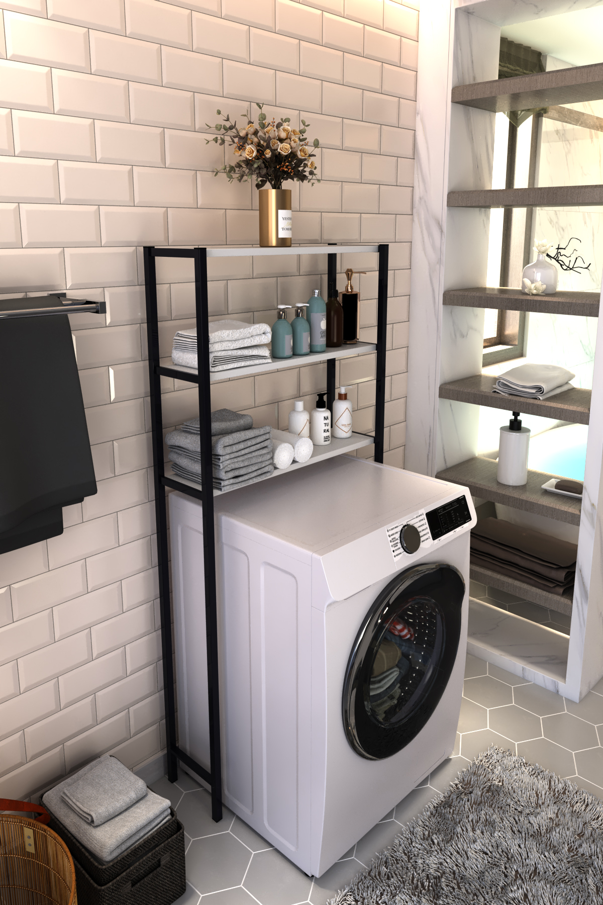 With its 3 shelf structures, it allows you to place your belongings on top of your washing machine in an orderly manner.