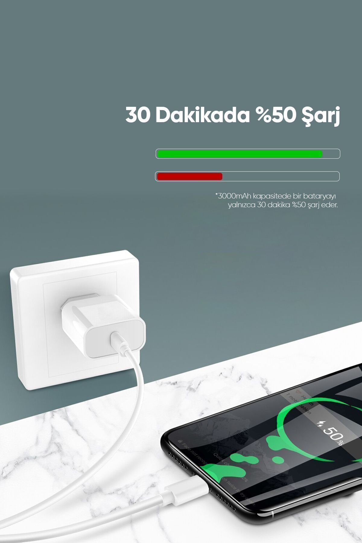 Charges a 3000 mAh battery up to 50% in just 30 minutes.