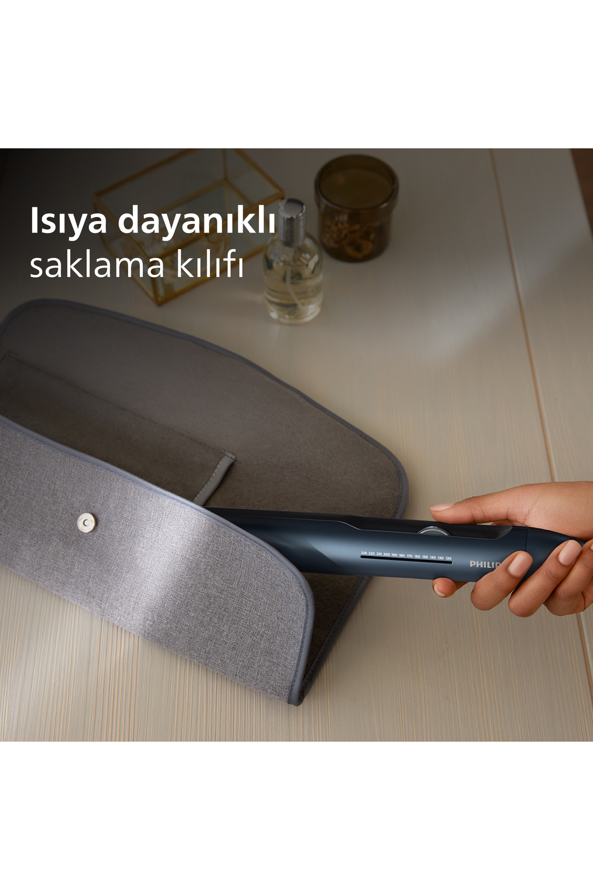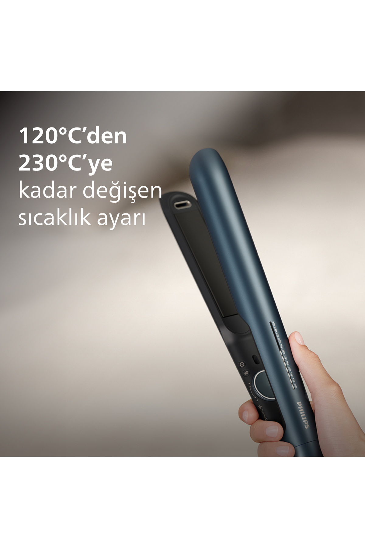 The fine hair straightener, which draws attention with its navy blue color, offers the lowest temperature level of 120°C.