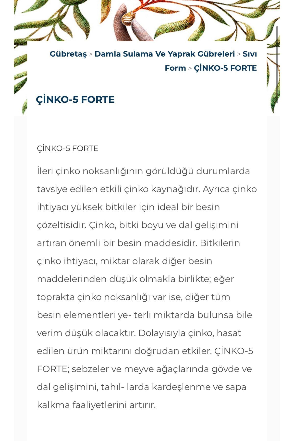 zinc-5 FORTE It is an effective source of zinc recommended in cases of advanced zinc deficiency. It is also an ideal nutrient solution for plants with high zinc needs. Zinc is an important nutrient that increases plant height and branch growth. Although the zinc requirement of plants is lower than other nutrients in terms of quantity,
