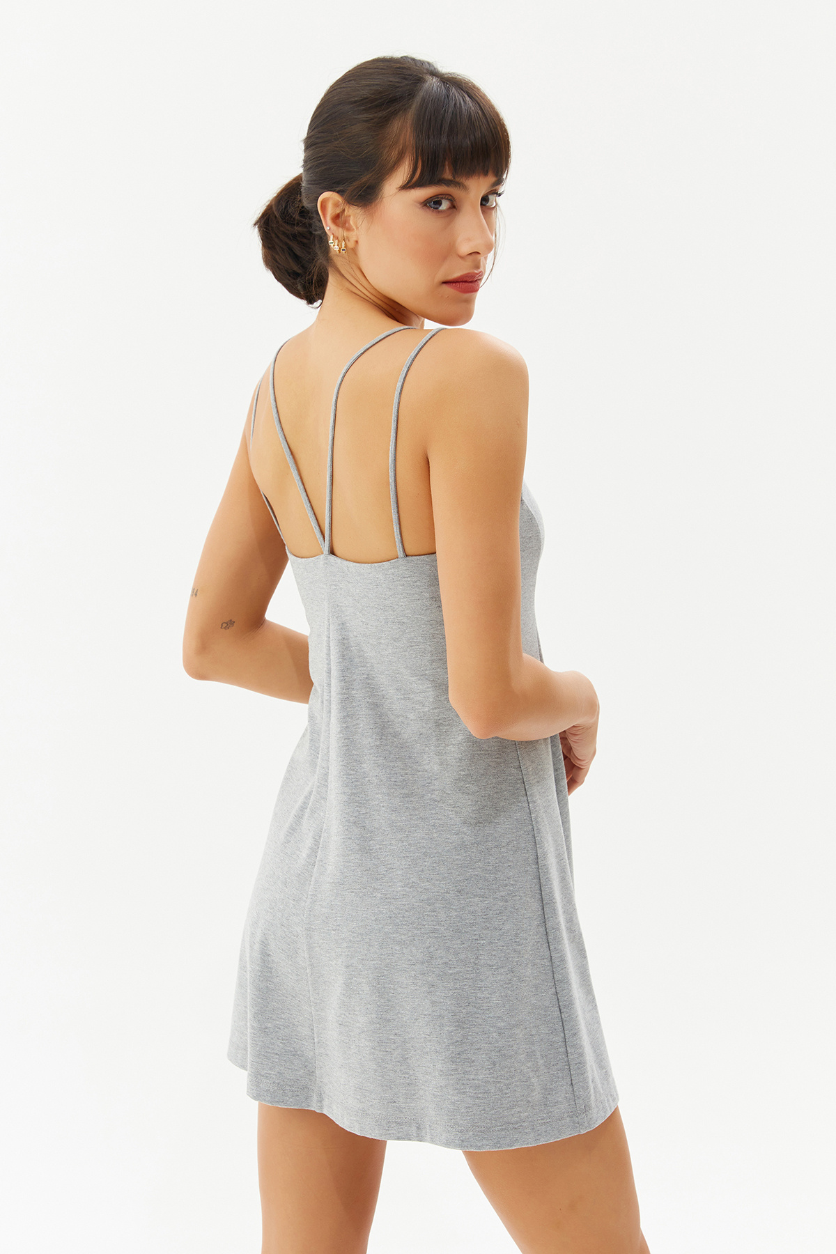Women's Gray Rope Strap Cotton Pullover Corset with Leggings Mini Sports and Tennis Dress Skirt 0119 Fabric: Cotlycra Fabric Specifications: 90% COTTON 10% ELASTANE Dress with thin strap, chest wrapper and pullover that completely wraps the body.