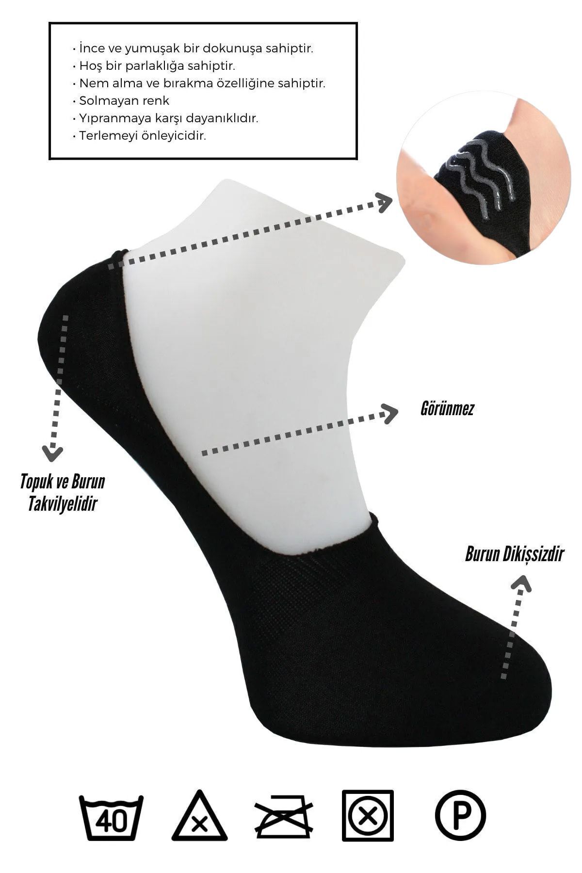 In addition, thanks to the "Anti-Slip Heel Silicone" feature, the heel part of the sock is effectively prevented from sliding down inside the shoe.