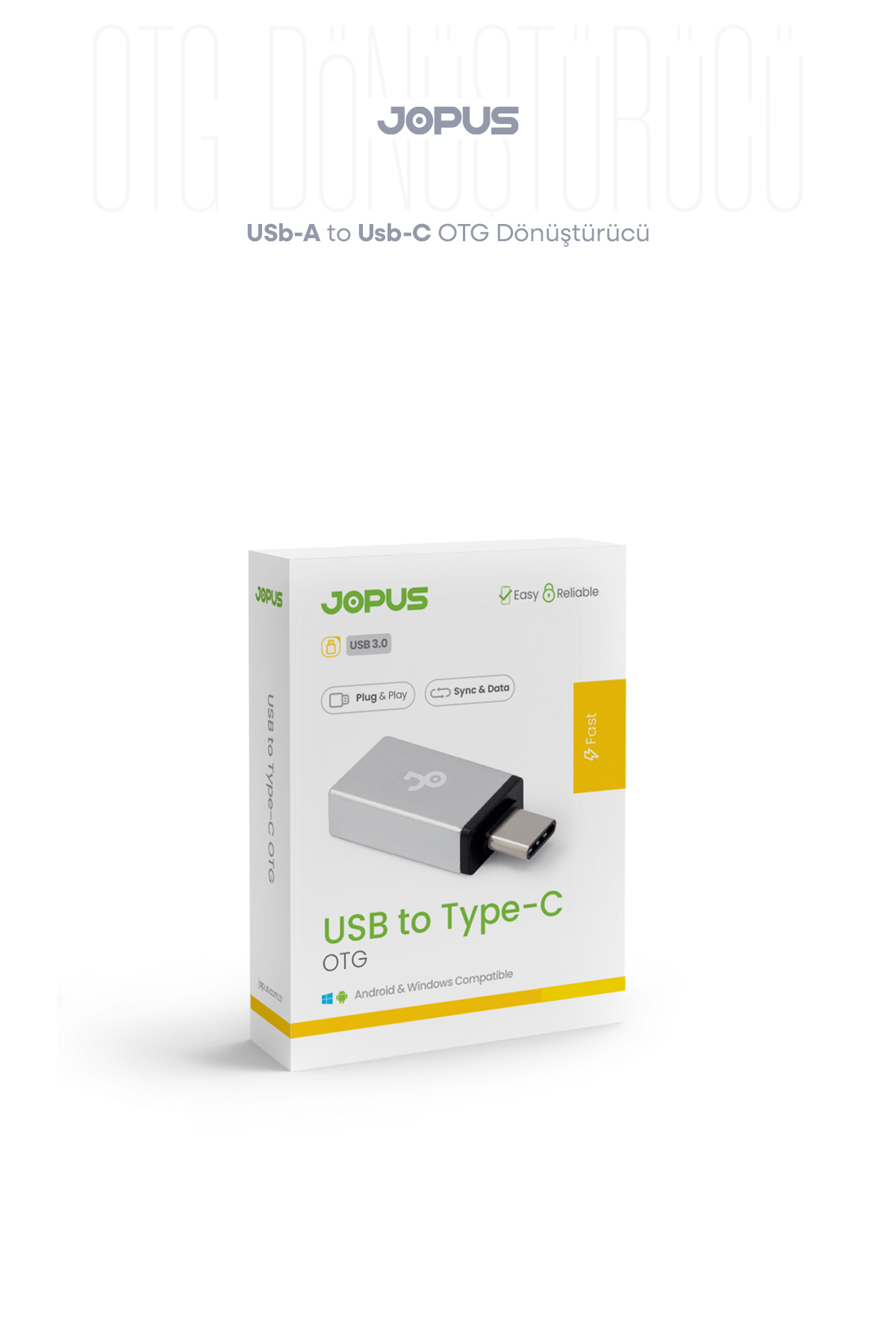 Package contents - 1 USB to Type-C OTG converter *Technical specifications -USB-A to Type-C connection - OTG supported use - USB 3.0 high speed support -Plug & Play - Data synchronization support - İOS, Android and Windows compatible - Compact and portable design
