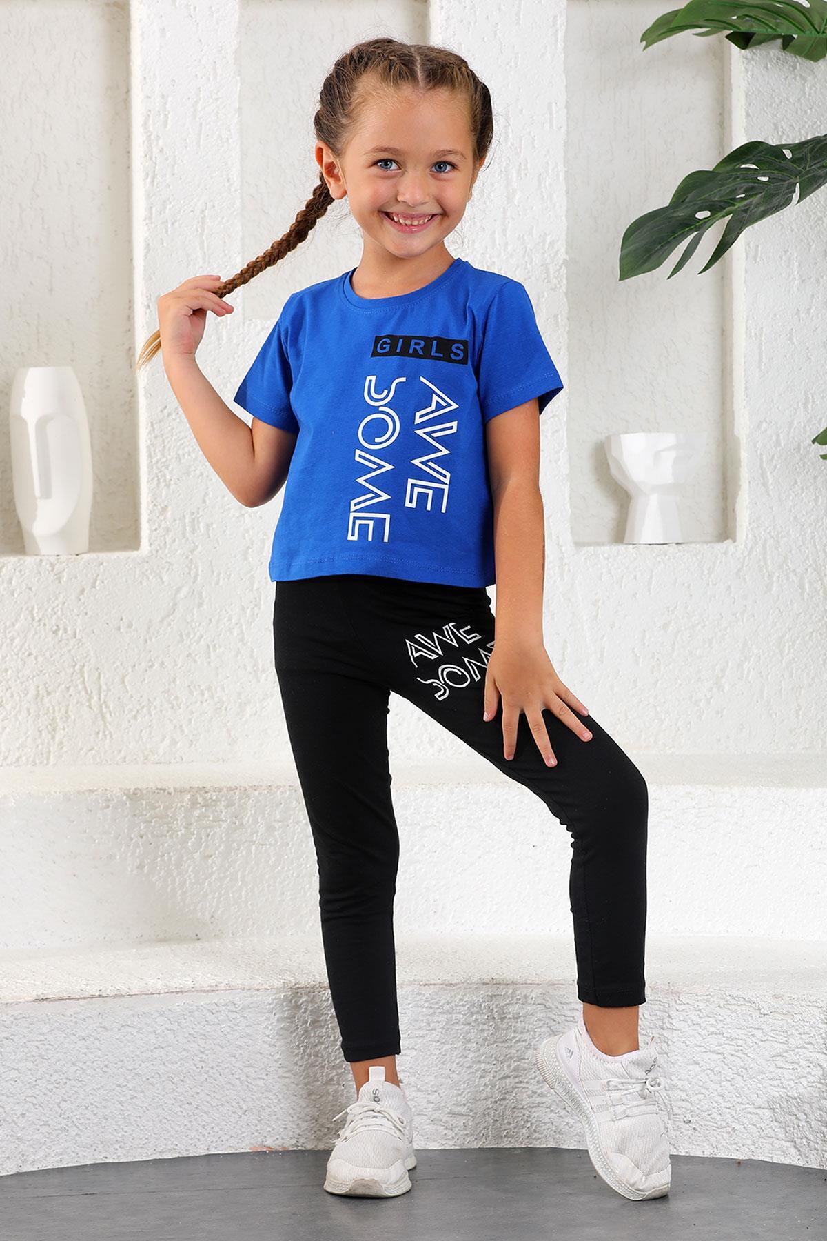 zepkids Crew Neck Short Sleeve Be Awe Some Printed Saxe Color Girls Leggings Set | ByTR