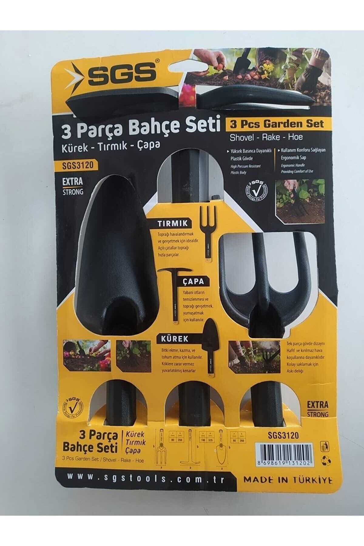 ANCHOR: Height-width-diameter: 32.5 cm, 19.5 cm RAKE: Height- width -diameter: 25 cm, 8cm SHOVEL Length- width -diameter: 28 cm, 8 cm