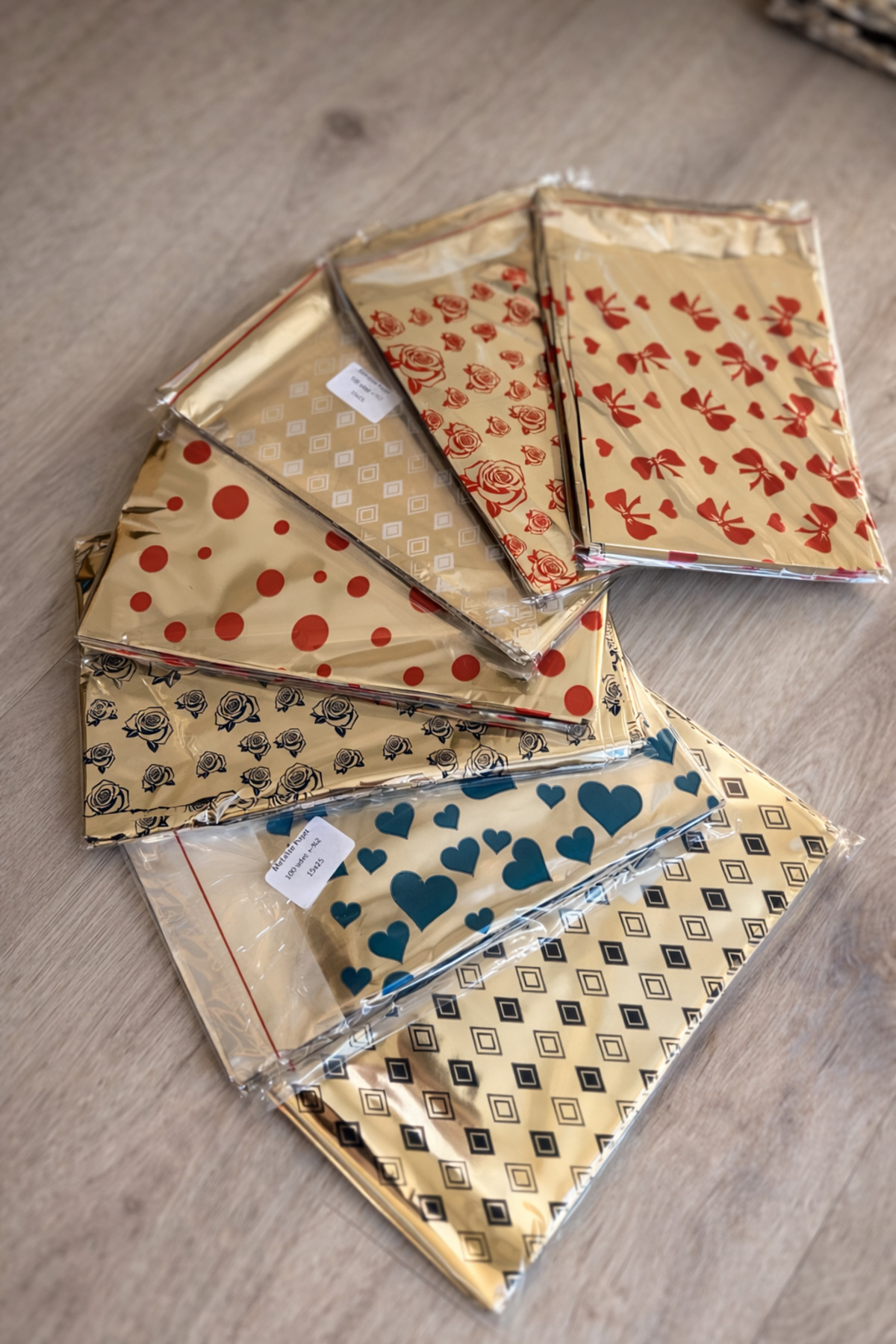 There are 100 banded metallized bags of the same pattern in a package.