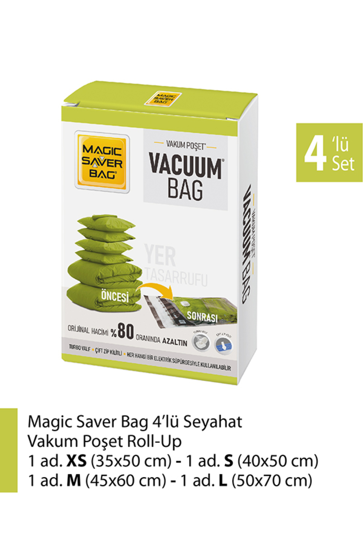 1 xsmall vacuum bag (35x50 cm) 1 small vacuum bag (40x60 cm) 1 medium vacuum bag (45x60 cm) 1 large vacuum bag (50x70 cm) How to use? Stage 1