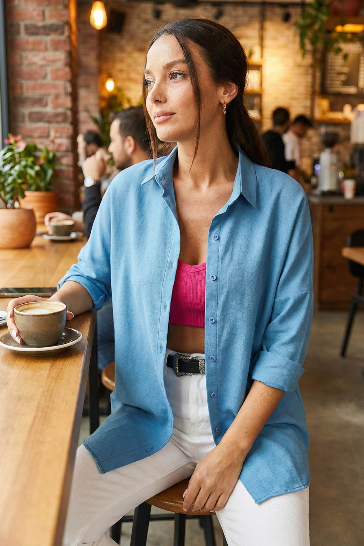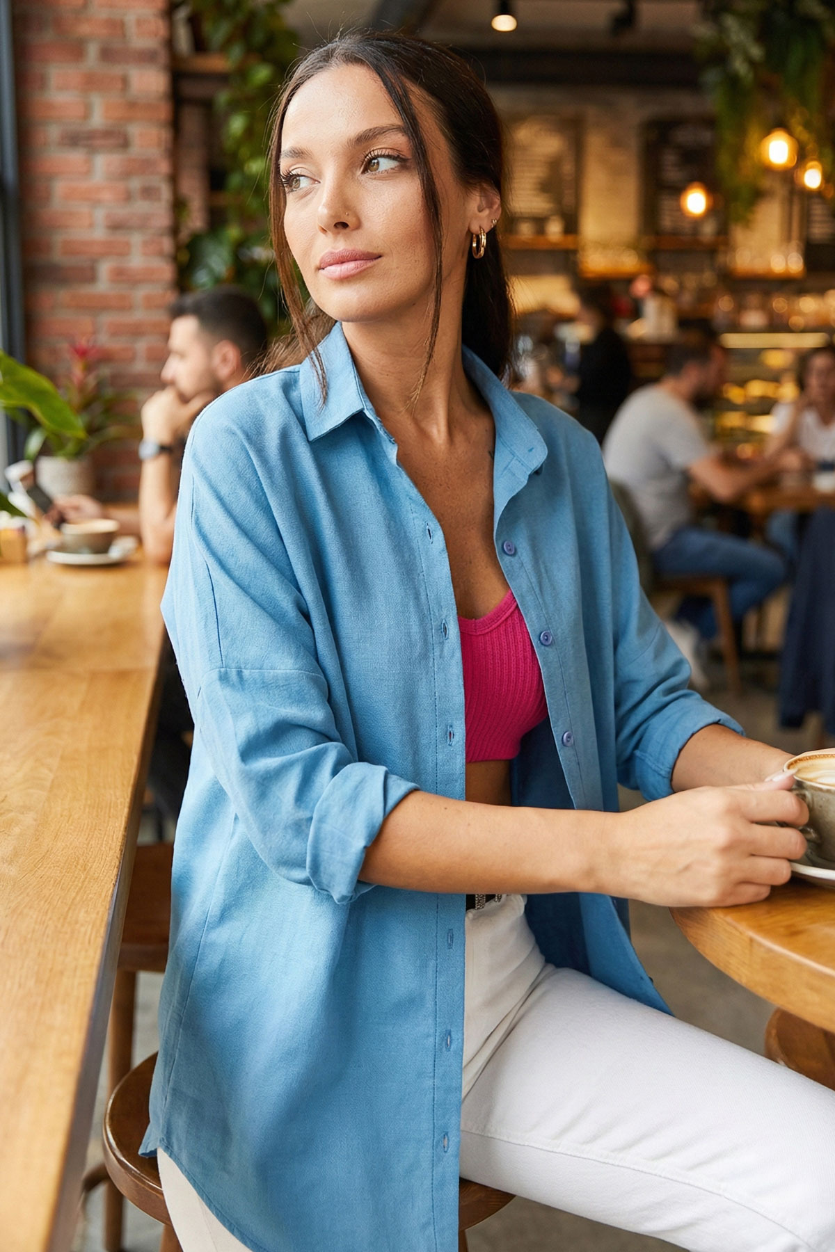 This women's frosted oversize long basic shirt offers a comfortable use with 70% cotton and 30% polyester content