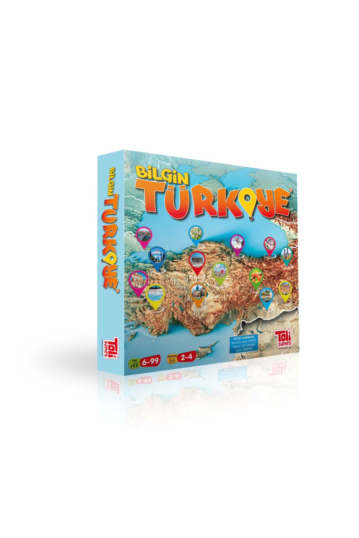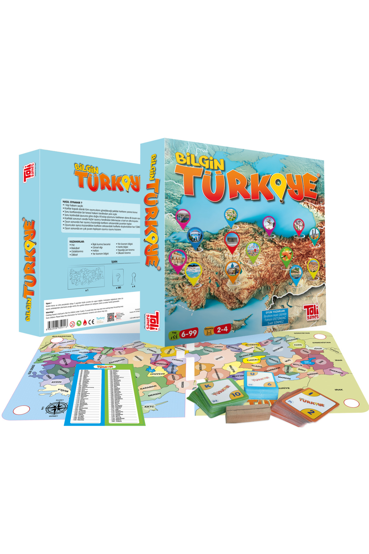 Bilgin Turkey Game How to Play? 1 person is selected as the referee. Pawns are dealt. Cards are placed face down around the map for all players to see. The referee selects 1 of the question cards. The selected card is opened to the ground by the referee. Based on the clues on the question card, the player who finds the right city places his pawn on top of the city. The player who places it first wins the card. If the answer to the question written on the card is not known to any player, the card is placed at the bottom. At the end of the game, each player collects the points behind the cards they have won. Players earn 10 points for each " TURKEY " inscription they create with the letters on the back of the cards they win. The player with the most points at the end of the game becomes the winner of Scholar Turkey. Box Contents