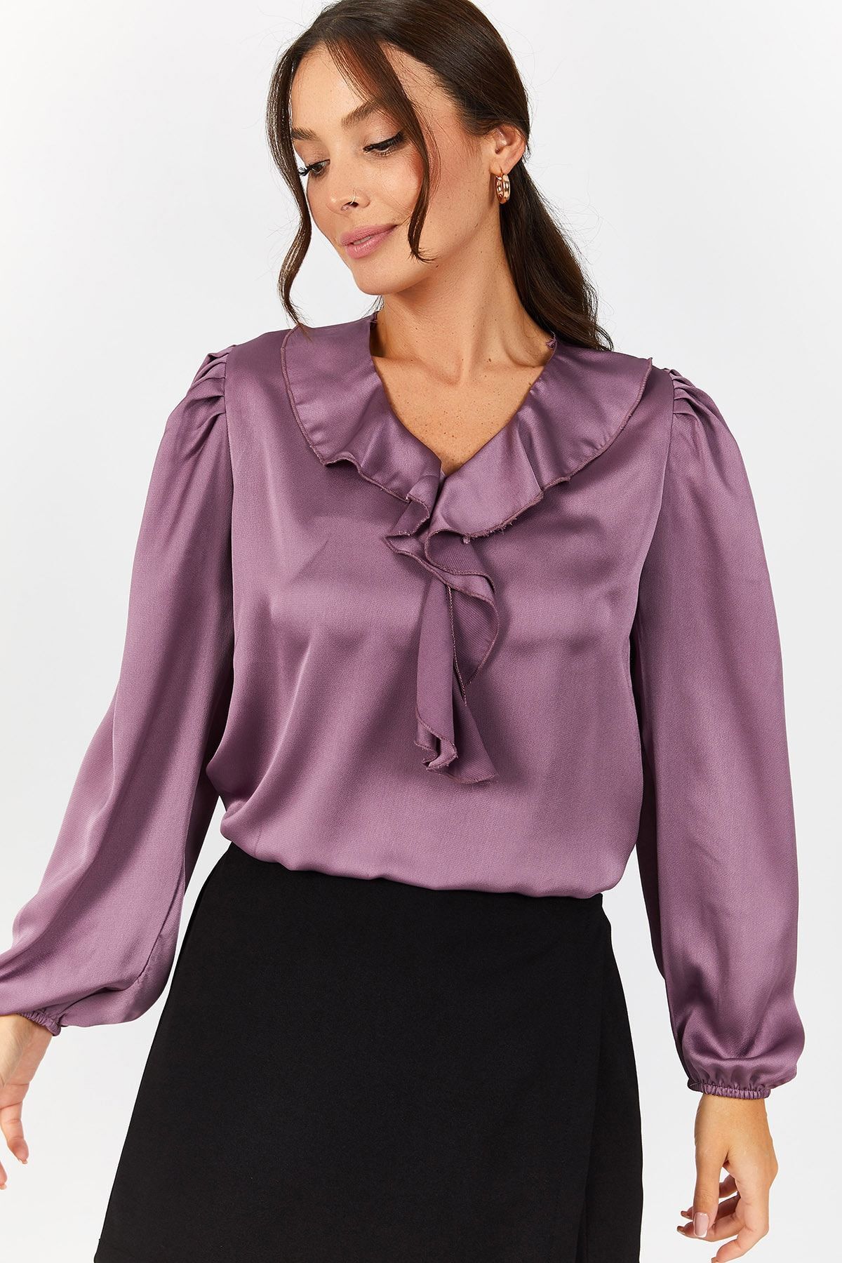 This piece, which has feminine lines with ruffle details, offers comfort with its shirred shoulder and elastic sleeves