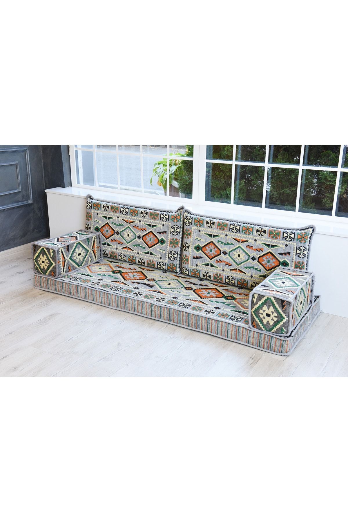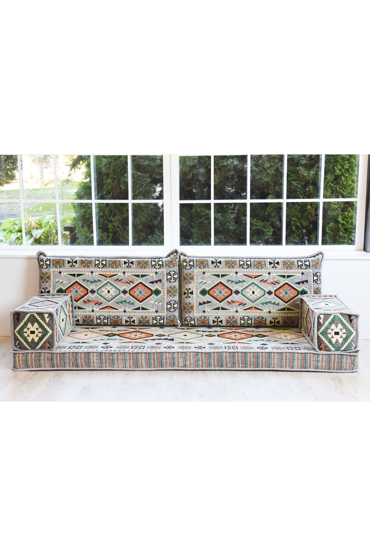 It consists of 5 pieces in total: 1 LONG SITTING CUSHION (70 x 190 x 10 cm), 2 BACK CUSHIONS (42 x 92 x 10 cm) , 2 ARMREST CUSHIONS (22 x 22 x 50 cm). In order to prevent the sponge from collapsing and sticking on the long sitting cushion and armrest cushion, Class 22-23 density sponge was used. 1st Quality 12 cm thick block gray sponge was used for long-term use in the backrest pillow. It is also referred to as Density. Density indicates the quality of the sponge. It refers to the amount of material in one m3 in kg. The PRODUCT IS THE SAME MODEL with back AND front and CAN BE USED AS DOUBLE-SIDED. THANKS TO ITS QUALITY WEAVING, IT DOES NOT DYE THE YARNS. The PRODUCT IS ZIPPERED AND can BE washed IN the WASHING MACHINE AT MAX. 30 DEGREES OR BY HAND. Our clips ARE HYGIENIC, DO NOT CONTAIN BACTERIA and DO not pile. Adds color to your room, hotels, cottage, vineyards, balconies, garden