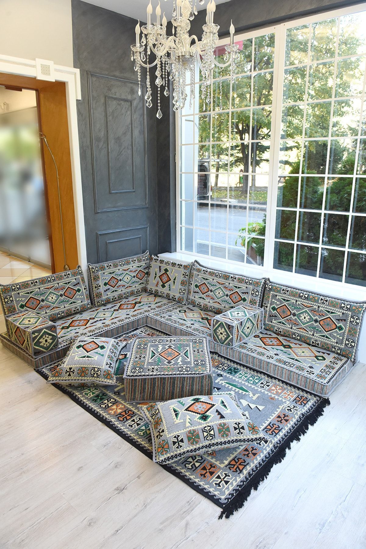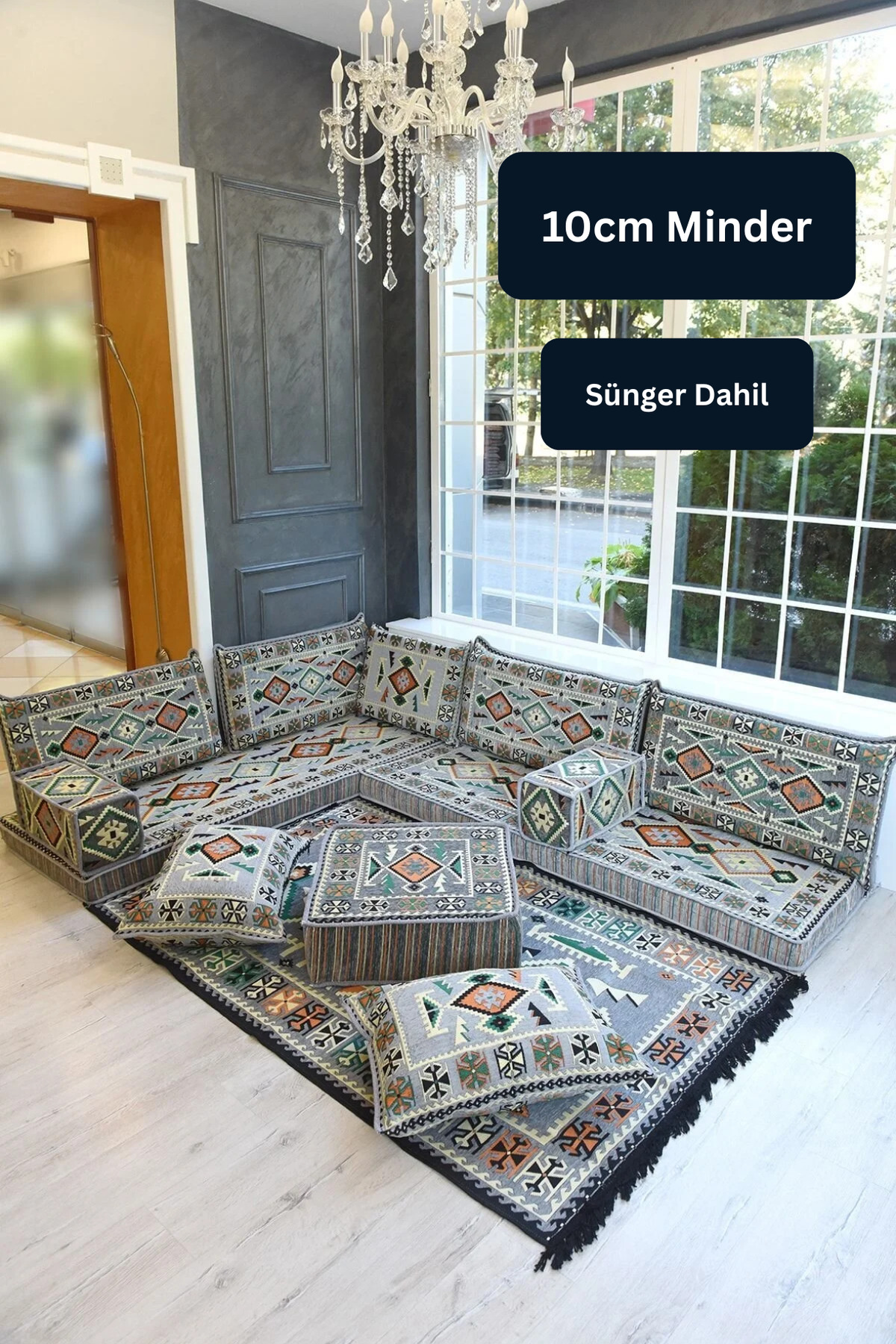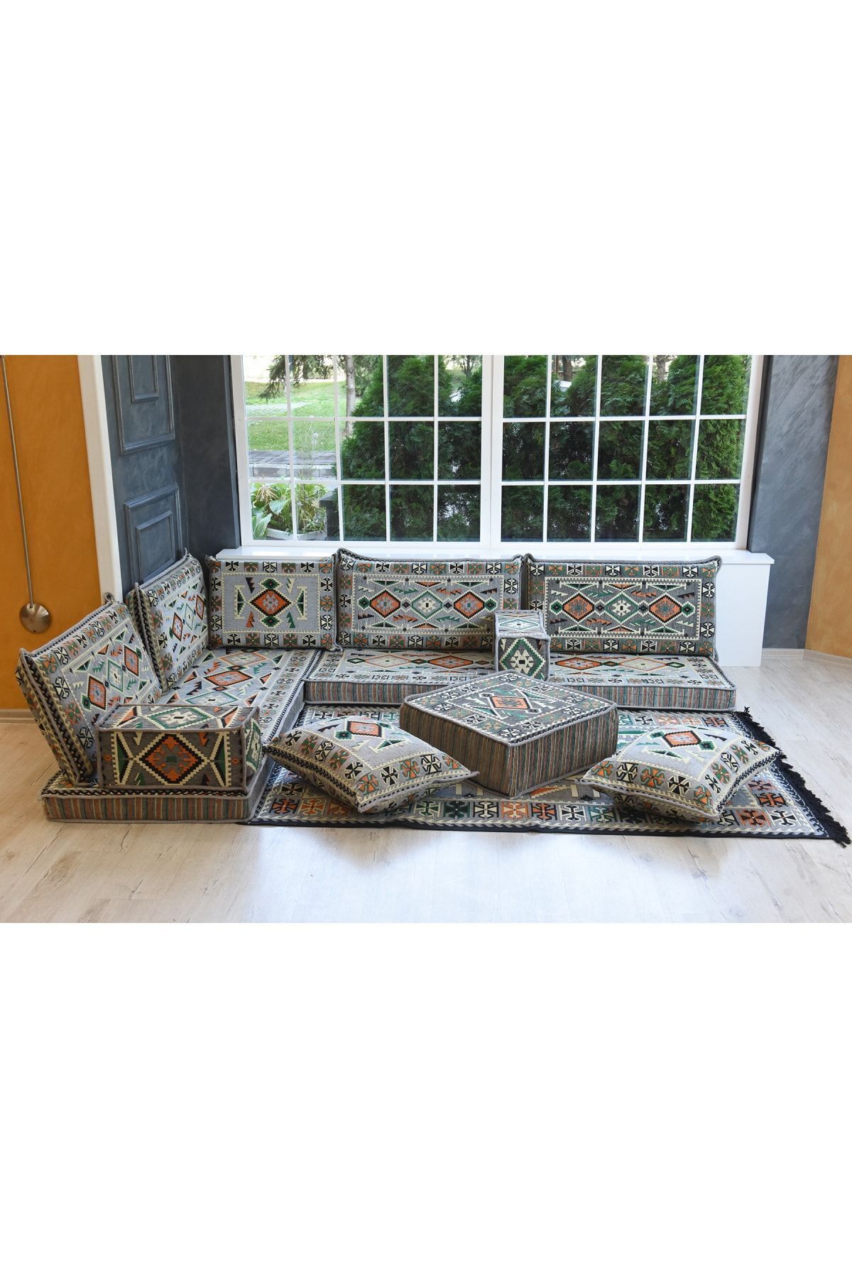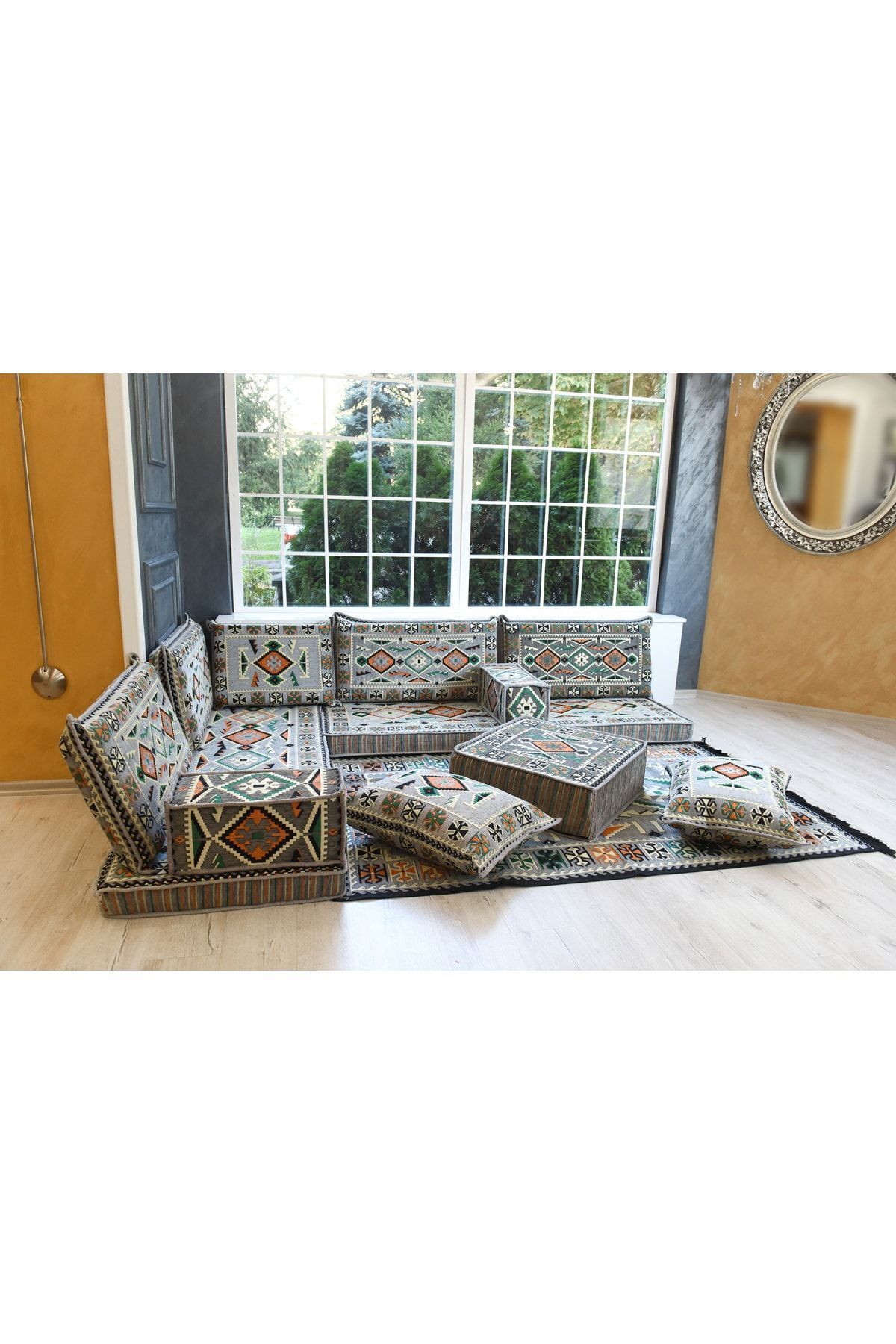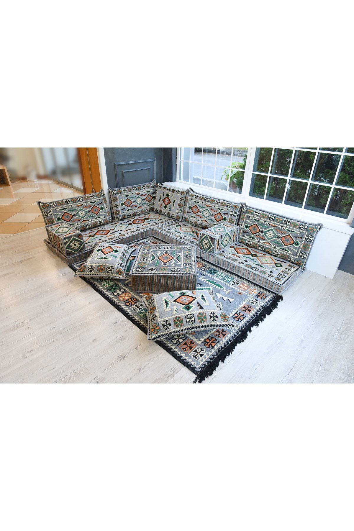 It consists of a total of 13 pieces, including 2 LONG SITTING CUSHIONS (70 x 190 x 10 cm), 4 BACK cushions (42 x 92 x 10 cm), 1 INTERMEDIATE BACK CUSHION (42 x 60 x 10 cm) , 2 ARMREST CUSHIONS (22 x 22 x 50 cm), 1 OTTOMAN SPONGE POUFFE COFFEE TABLE( 60 x 60 x 20 cm), 2 FILLED FLOOR cushions (45 x 65 cm) and 1 RUG ( 120 cm x 180 cm ). In order to prevent the sponge from collapsing and sticking on the long sitting cushion and armrest cushion, Class 22-23 density sponge was used. 1st Quality 12 cm thick block gray sponge was used for long-term use in the backrest pillow. It is also referred to as Density. Density indicates the quality of the sponge. It refers to the amount of material in one m3 in kg. THE PRODUCT IS THE SAME MODEL WITH BACK AND FRONT AND CAN BE USED AS DOUBLE-SIDED. THANKS TO ITS QUALITY WEAVING, IT DOES NOT DYE THE YARNS. THE PRODUCT IS ZIPPERED AND MAX. IT CAN BE WASHED IN THE WASHING MACHINE AT 30 DEGREES OR BY HAND. OUR CLIPS ARE HYGIENIC, DO NOT CONTAIN BACTERIA AND DO NOT PILE. Adds color to your room, hotels, cottage, vineyards, balconies, garden