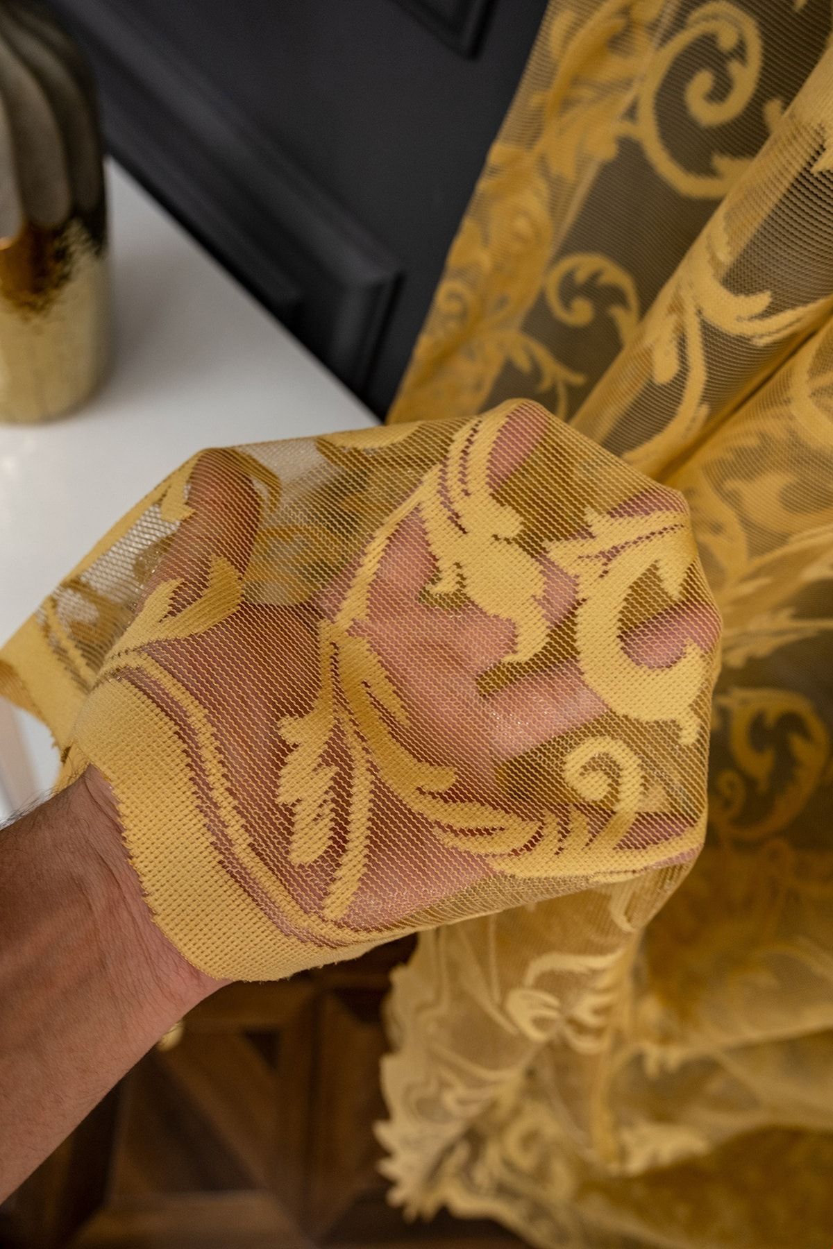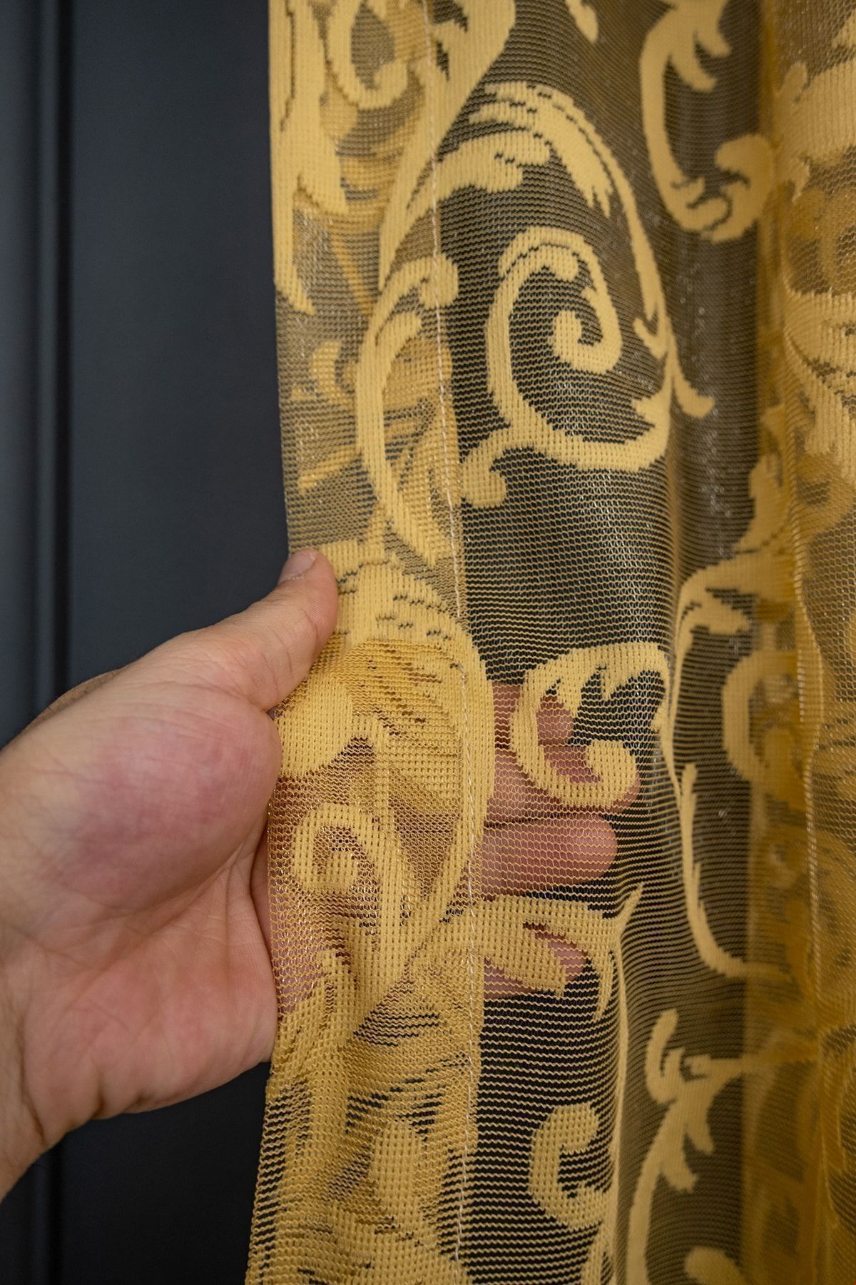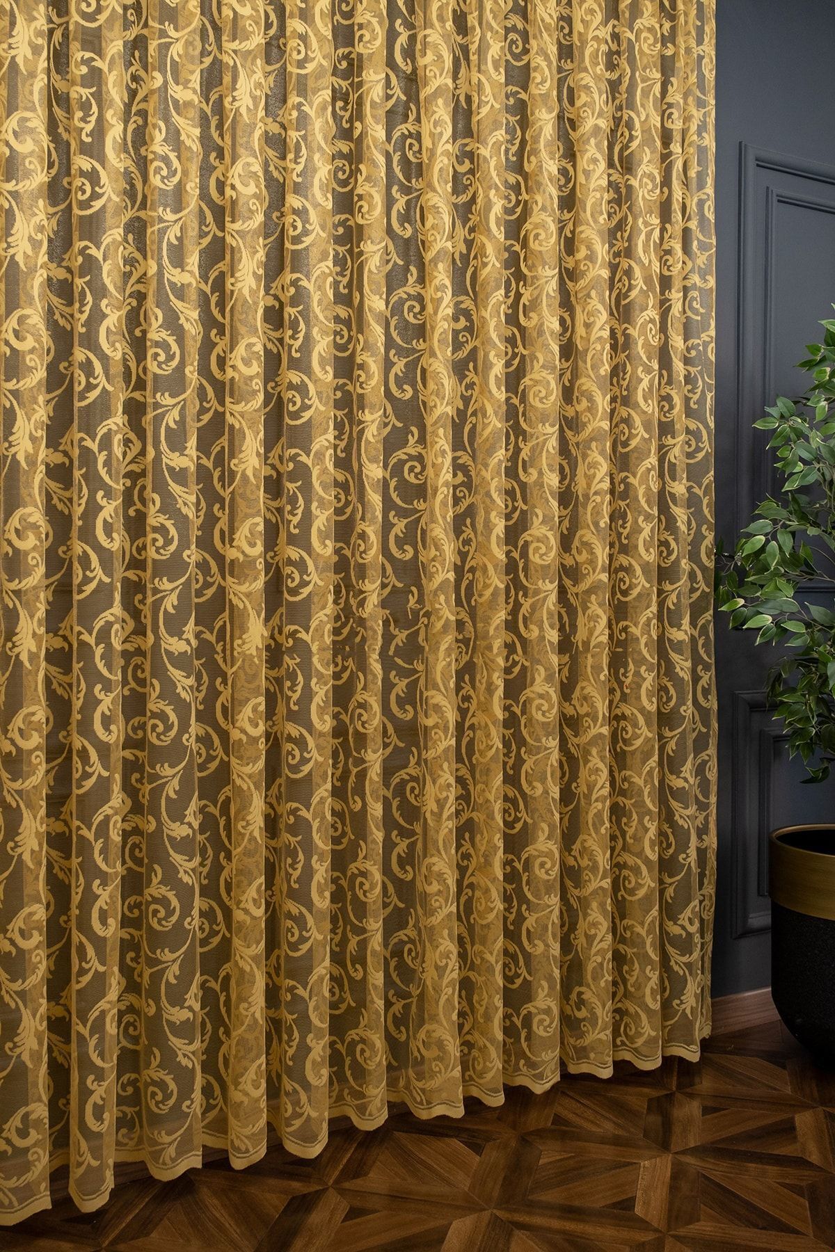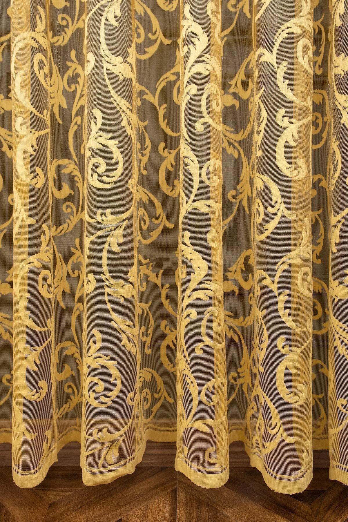 farbateks Classic Shawl Pattern Mustard Dark Yellow Pattern Design 2 Layers Pleated Tulle Curtain | ByTR