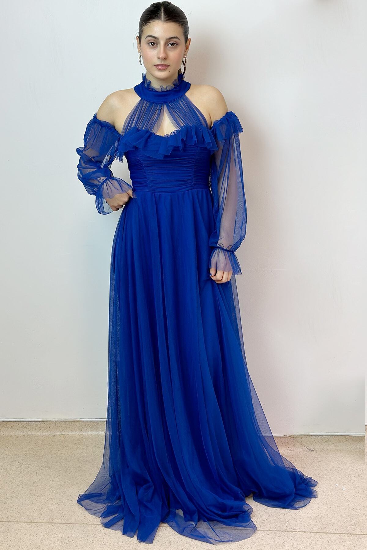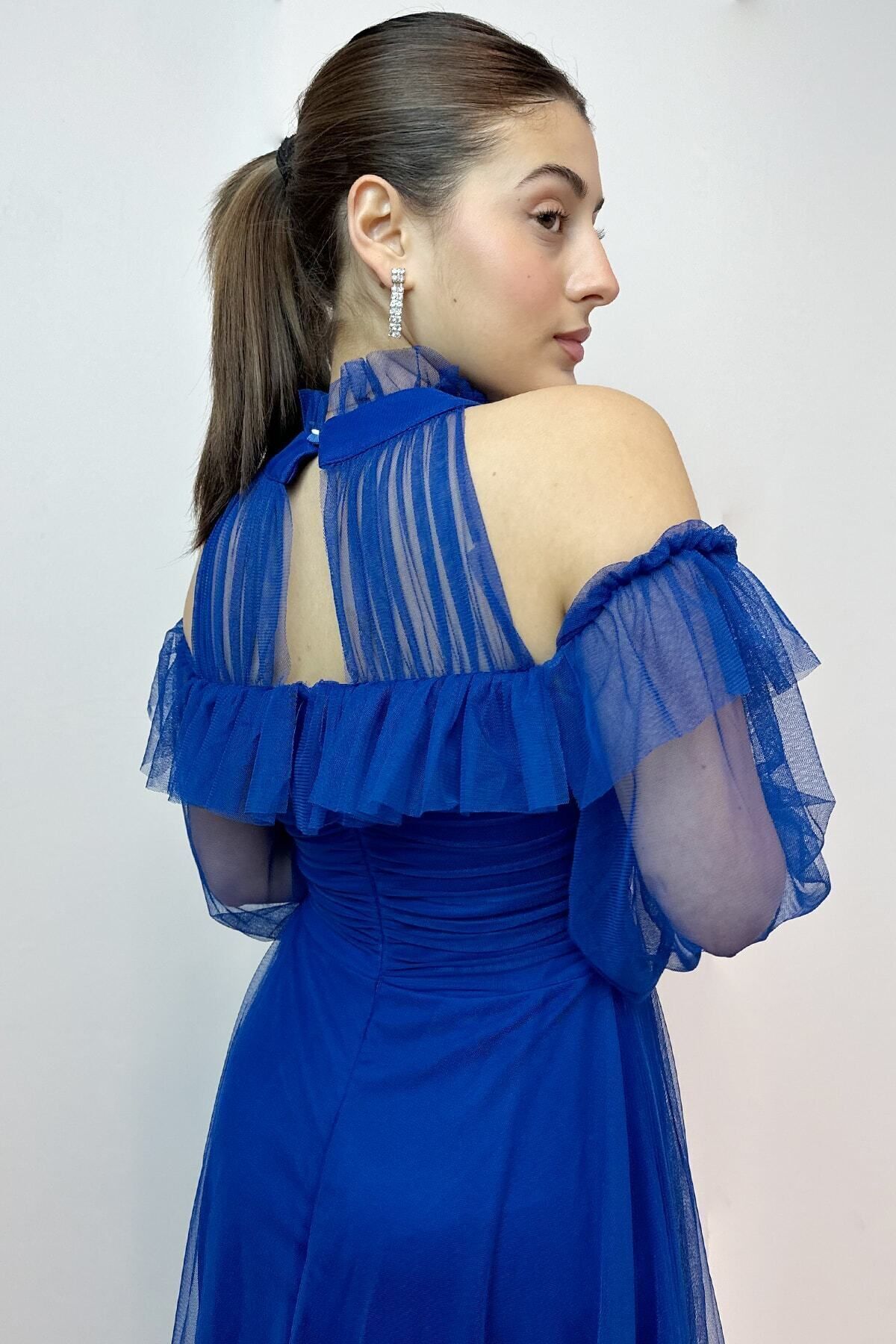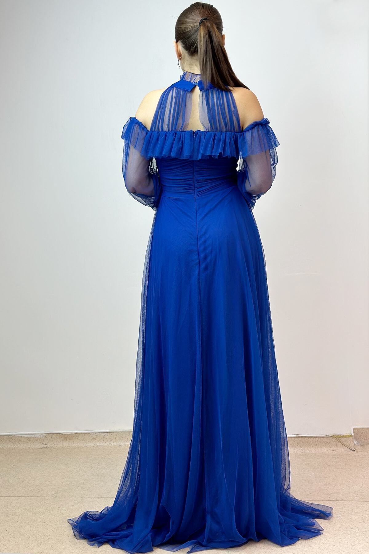 This special evening dress will crown every special moment with its sax blue color, tulle draped details, and plus size cut.
