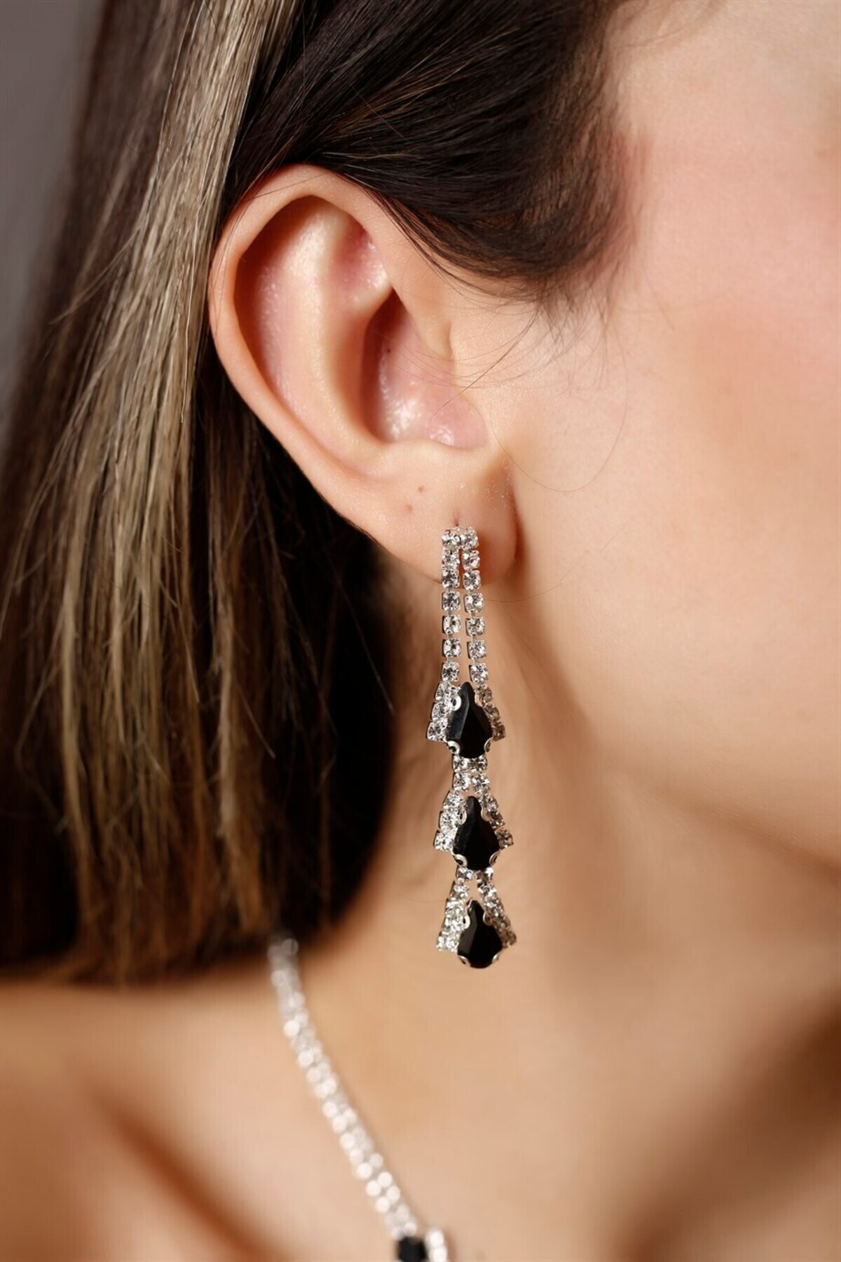 Creates a modern and sophisticated style with black drop stone details